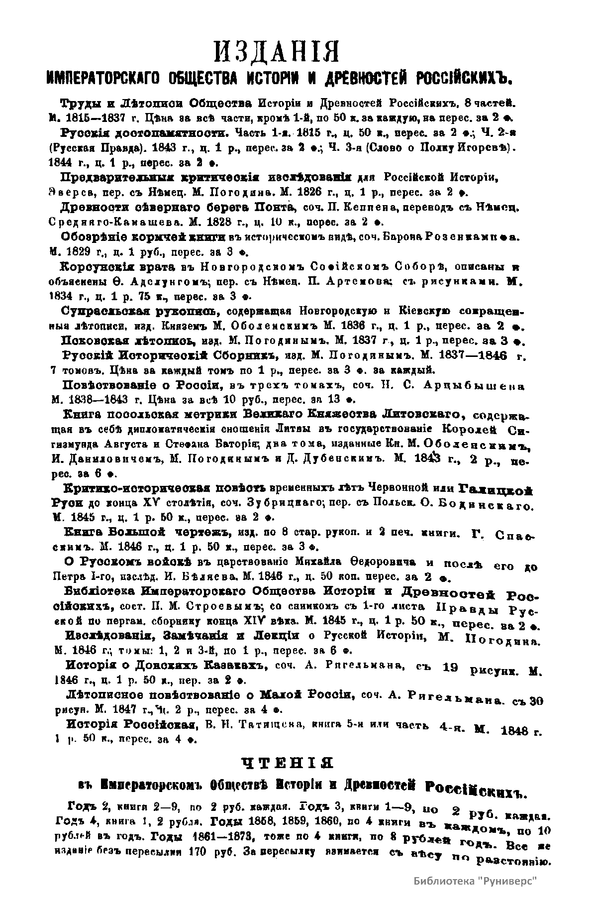 «Чтения в Императорском обществе истории и древностей российских» – периодическое издание трудов Общества. Выпускались отдельными книгами на протяжении 72 лет с десятилетним перерывом. Первая книга вышла в свет в январе 1846 г. Каждая книга состояла из четырех разделов: исторических исследований, отечественных исторических документальных материалов, иностранных материалов и смеси. Публиковались также исследования и материалы по археологии, этнографии, нумизматике, палеографии и другим дисциплинам. До июня 1848 г. было выпущено 23 книги «Чтений». В июньской книге за 1848 г. О. М. Бодянский поместил записки Дж. Флетчера о Московском государстве, что вызвало недовольство Николая I. «Чтения» были закрыты, а Бодянский удален из Московского университета. Издание «Чтений» возобновилось только в 1858 г., когда Бодянский снова стал секретарем общества. Издание приняло славянофильское направление, к прежним четырем разделам «Чтений» прибавился раздел славянских материалов. С 1858 г. «Чтения» выходили в свет четыре раза в год.
