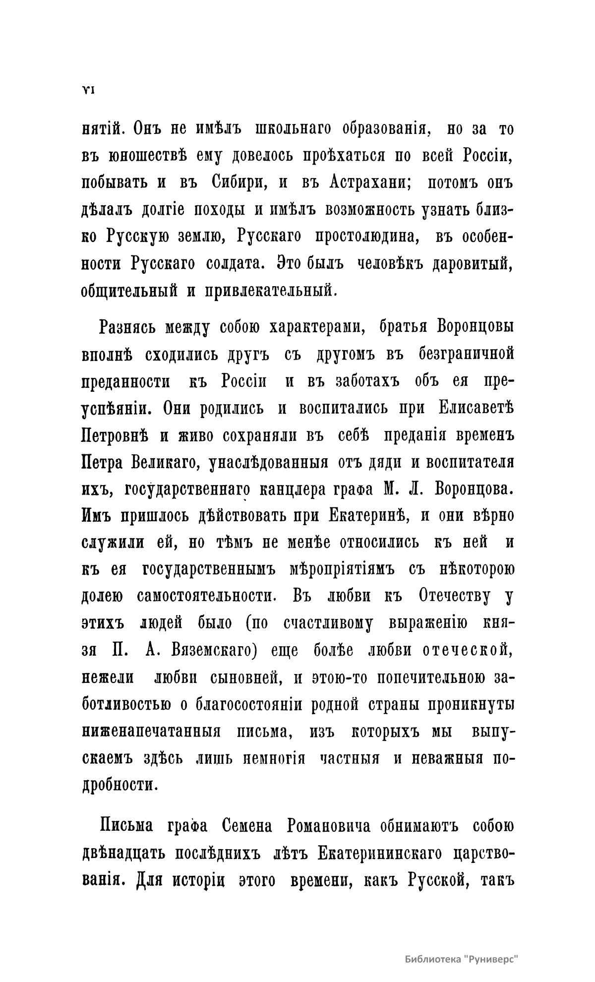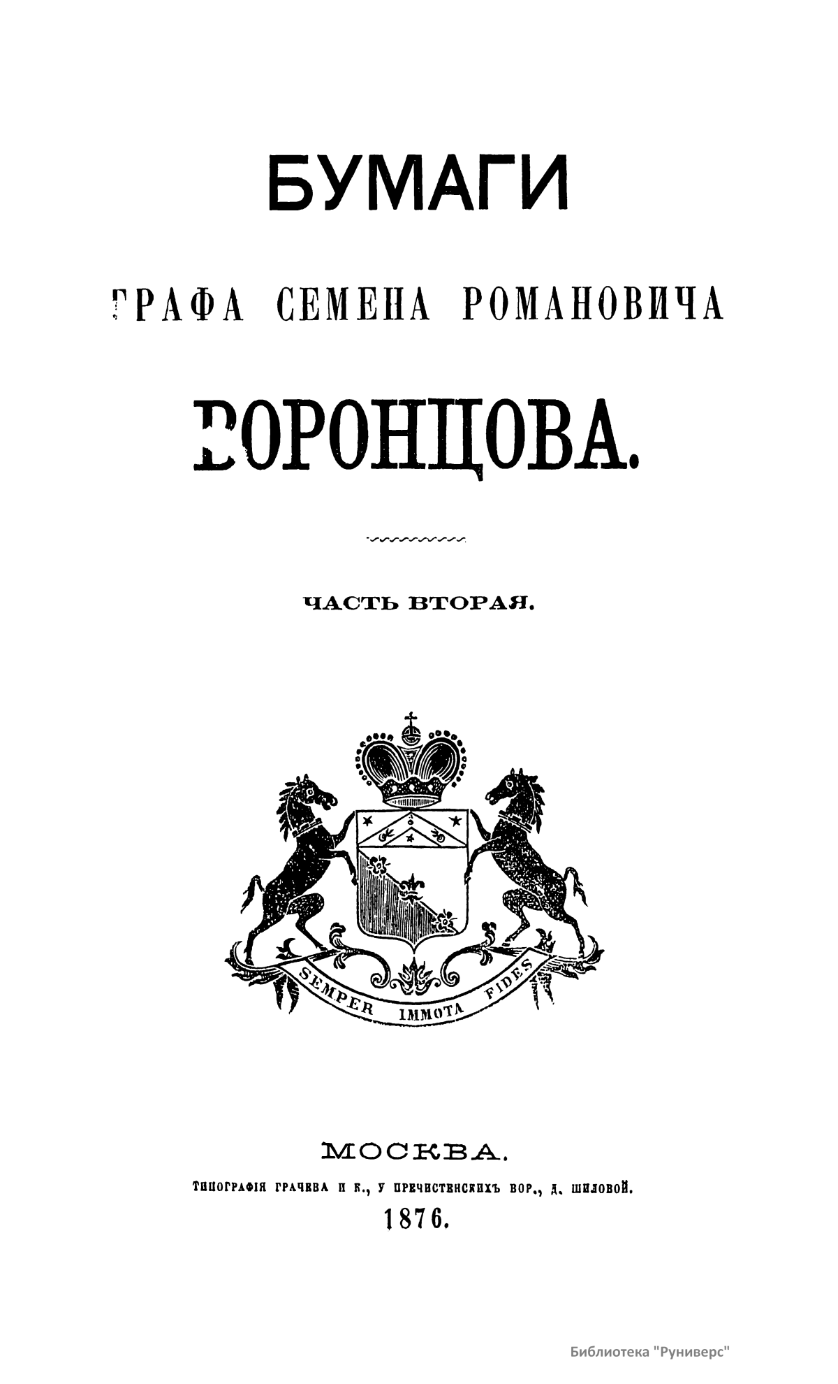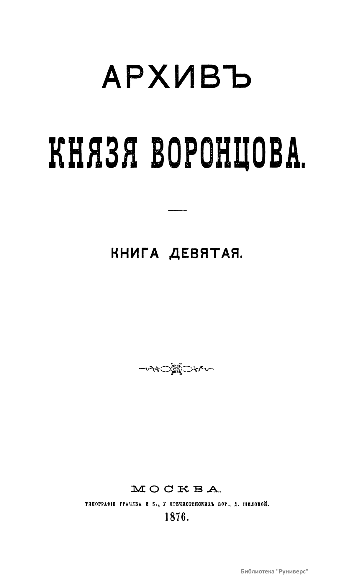 Издание представляет документы из архива графов (с 1845 г. князей) Воронцовых, крупных политических деятелей России XVIII и XIX вв.: Михаила Илларионовича (1714 – 1767) – канцлера при Елизавете Петровне; Романа Илларионовича (1707 – 1783); Александра Романовича (1741 – 1805) – канцлера в 1802 – 1804 гг.; Семена Романовича (1744 – 1832) – посла в Англии в 1785 – 1806 гг.; Михаила Семеновича (1782 – 1856) – фельдмаршала, наместника Кавказа в 1845 – 1853 гг. Архив издан в 40 тт. (1870 – 1895) под редакцией П. И. Бартенева. Содержит огромный материал по внешней политике, по управлению хозяйством Елизаветы Петровны (кн. 1), по делу Миниха и Бирона (кн. 2), о «чумном бунте» 1771 г. в Москве, о движении Е. И. Пугачева (кн. 16), о А. Н. Радищеве (кн. 5, 12, 24). Книга 21-я занята «Записками» Е. Р. Воронцовой (Дашковой). В книге 24-й – свыше 100 писем А. В. Суворова. Среди обширной переписки Воронцовых встречаются письма Вольтера, Д'Аламбера, Жозефа де Местра, Костюшки, Талейрана, Питта и др.