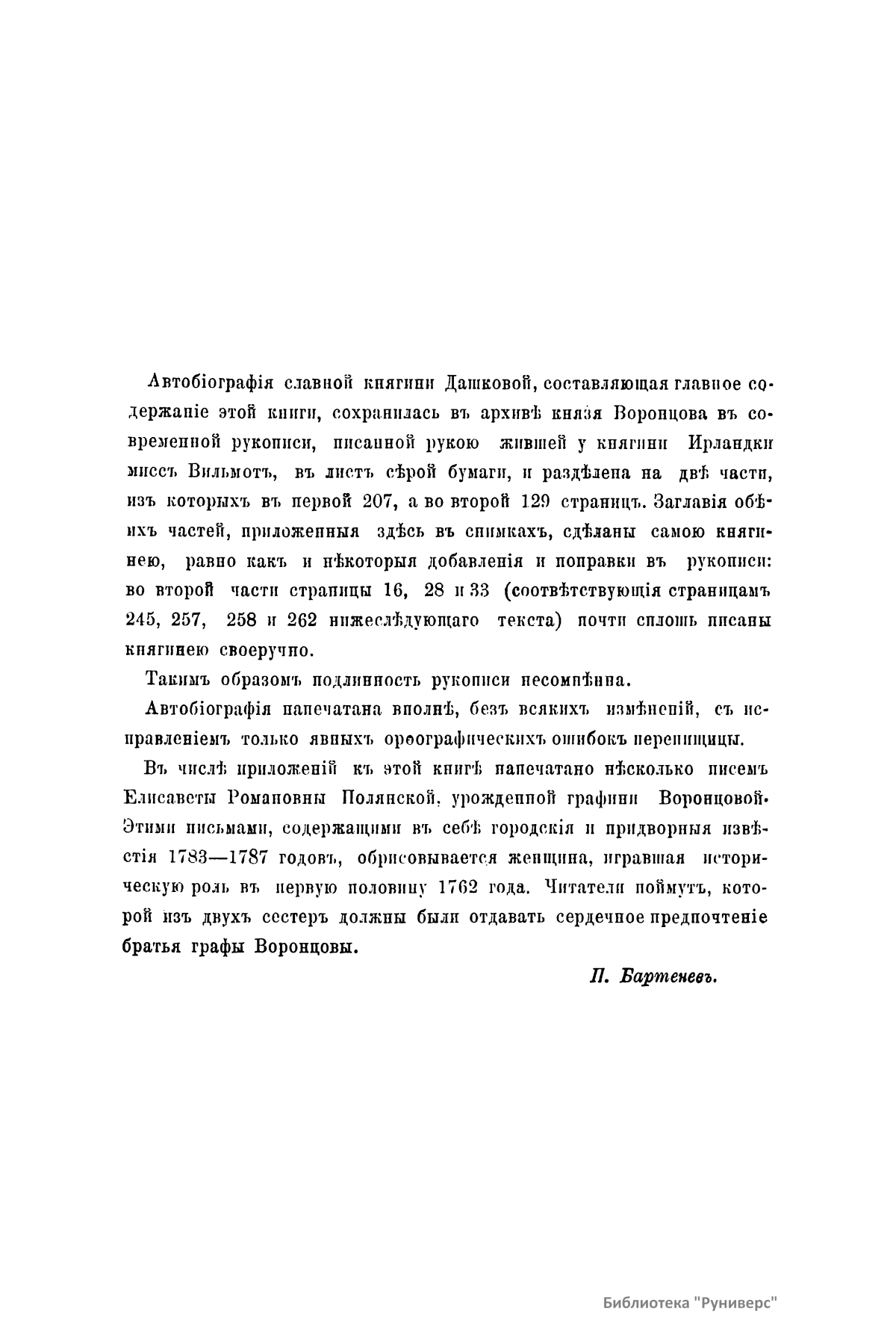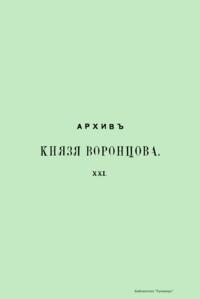 Издание представляет документы из архива графов (с 1845 г. князей) Воронцовых, крупных политических деятелей России XVIII и XIX вв.: Михаила Илларионовича (1714 – 1767) – канцлера при Елизавете Петровне; Романа Илларионовича (1707 – 1783); Александра Романовича (1741 – 1805) – канцлера в 1802 – 1804 гг.; Семена Романовича (1744 – 1832) – посла в Англии в 1785 – 1806 гг.; Михаила Семеновича (1782 – 1856) – фельдмаршала, наместника Кавказа в 1845 – 1853 гг. Архив издан в 40 тт. (1870 – 1895) под редакцией П. И. Бартенева. Содержит огромный материал по внешней политике, по управлению хозяйством Елизаветы Петровны (кн. 1), по делу Миниха и Бирона (кн. 2), о «чумном бунте» 1771 г. в Москве, о движении Е. И. Пугачева (кн. 16), о А. Н. Радищеве (кн. 5, 12, 24). Книга 21-я занята «Записками» Е. Р. Воронцовой (Дашковой). В книге 24-й – свыше 100 писем А. В. Суворова. Среди обширной переписки Воронцовых встречаются письма Вольтера, Д'Аламбера, Жозефа де Местра, Костюшки, Талейрана, Питта и др.