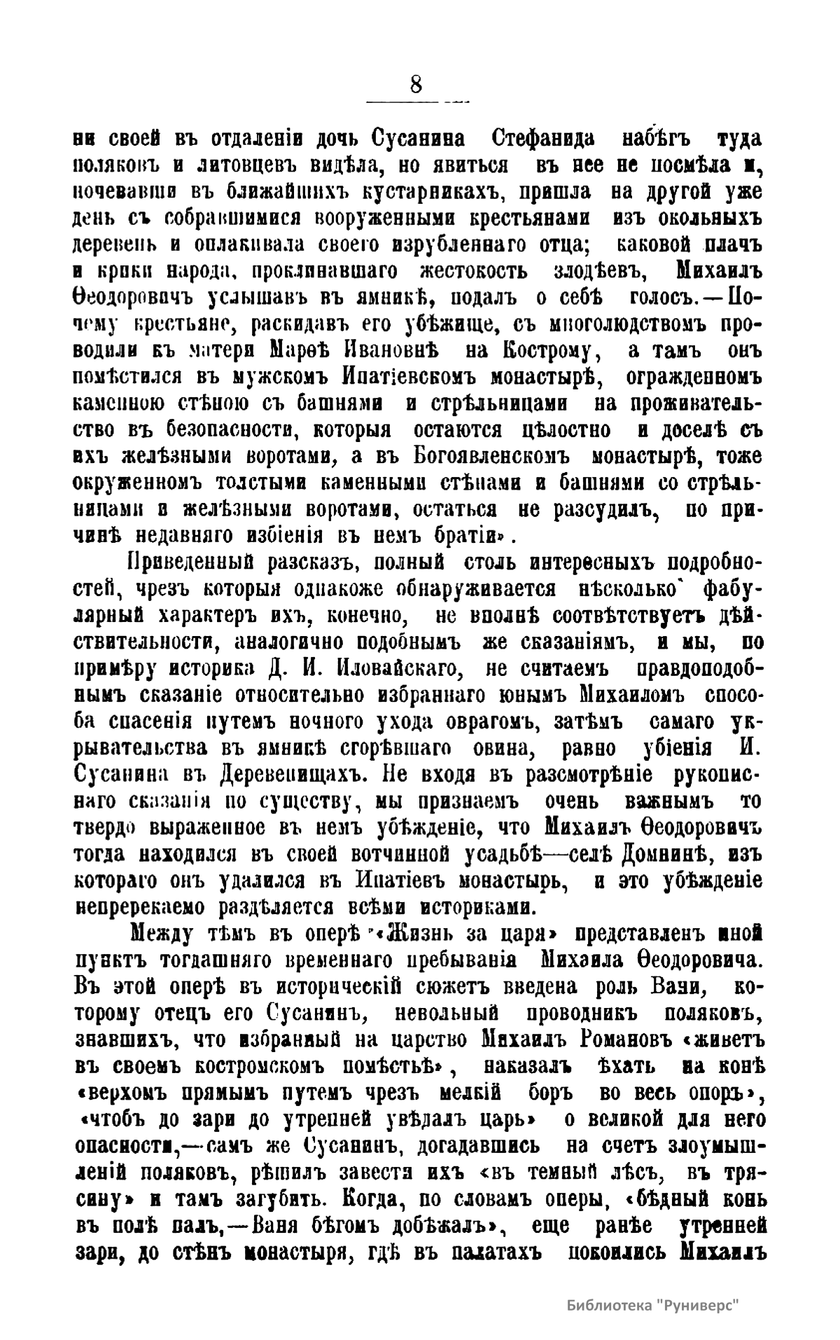 Романовы – боярский род в России XIV – XVI вв., потомки выходца из Литвы Андрея Кобылы. До начала XVI в. именовались Кошкиными, до конца XVI в. – Захарьиными. С 1613 г. царская, с 1721 г. – императорская династия. Михаил Федорович – первый царь из рода Романовых. Настоящее издание подготовлено к трехсотлетней годовщине царствования Дома Романовых. Издатель считает необходимым к предстоящему юбилею установить с исторической точностью разные эпизоды, относящиеся к обстоятельствам избрания и воцарения Михаила Федоровича, и, в частности, проясняет вопрос, где Михаил Федорович Романов с матерью инокинею Марфою нашел безопасное для себя убежище от преследований поляков в начале 1613 года.