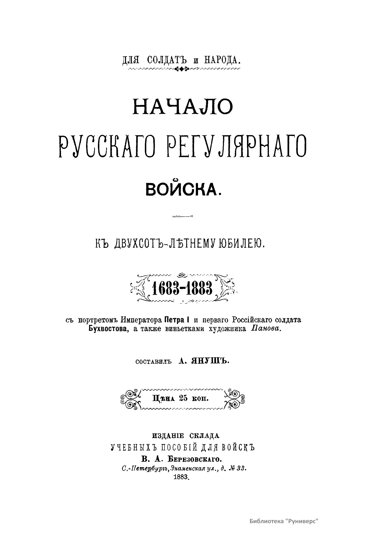 Брошюра издана в 1883 г. к двухсотлетнему юбилею русского регулярного войска. Начало регулярному войску в России (т.е. такому войску, «которое правильно обучено, одинаково одето и вооружено; которое составляется из людей, знающих военное дело и способных по команде одного лица стройно и беспрекословно исполнять приказ»), основанием «Потешных солдат», положил император Петр Великий. Старейшим регулярным полком считается лейб-гвардии Преображенский. С него и ведется начало регулярного войска в России. От «Потешных» ведут свое начало лейб-гвардии Семеновский полк и 1-я батарея лейб-гвардии 1-й Артиллерийской бригады. Автор рассматривает следующие темы: русское войско до Петра I (5); царь Петр I (9); Потешные. Первое регулярное войско (15); доблести первого регулярного войска (28).Юбилейное издание украшено виньетками художника Панова. Также здесь представлены портреты Петра I и первого российского солдата Бухвостова.