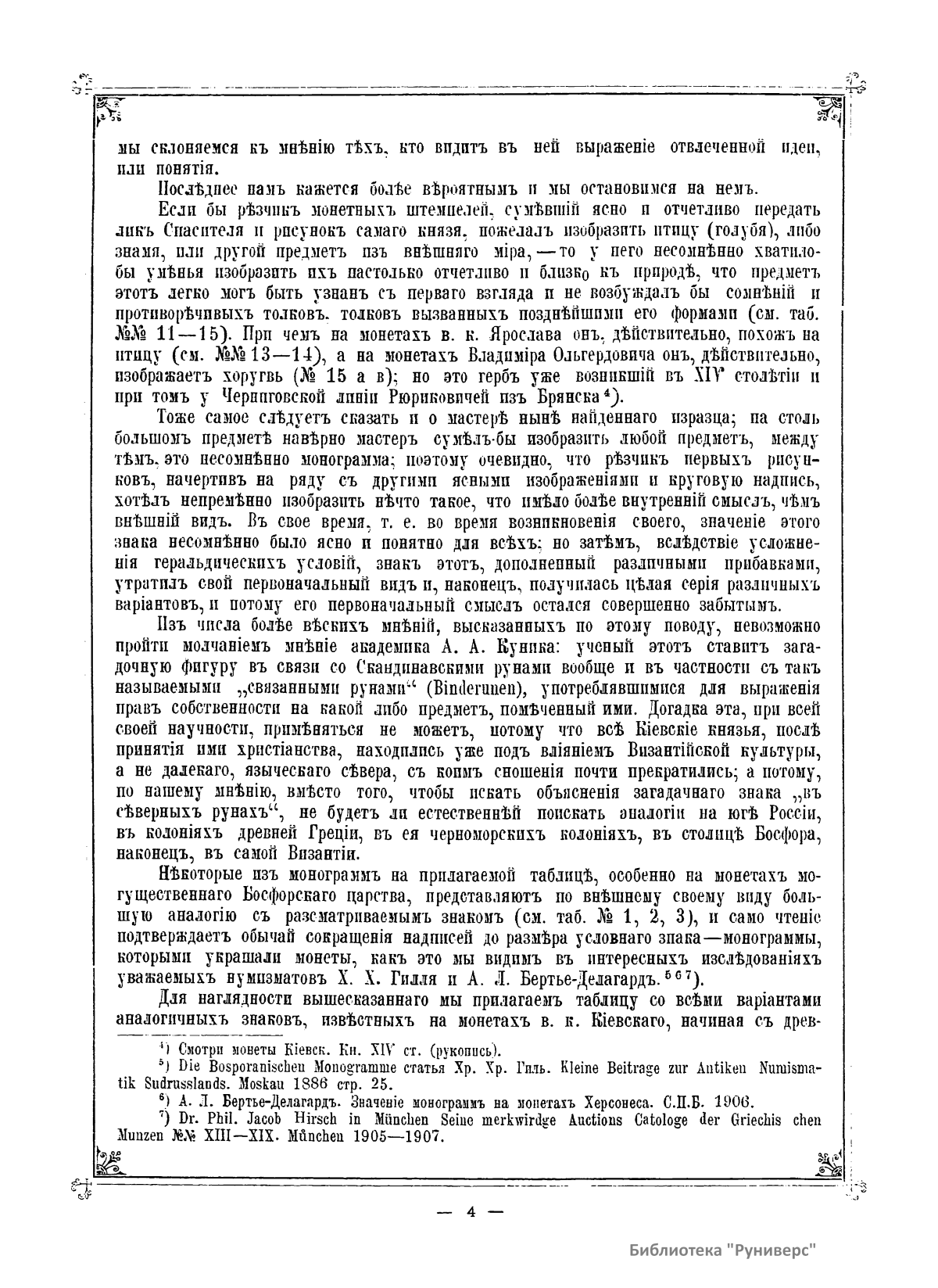 Геральдическое исследование, в котором автор отвечает на вопрос, что означает загадочный знак на монетах, приписываемых великому князю Владимиру Святому. Сделать вывод ему помогают результаты раскопок в усадьбе Г. Петровского в 1907 г., когда был обнаружен кусок изразца с начертаниями своеобразной фигуры, аналогичной изображению на монетах.