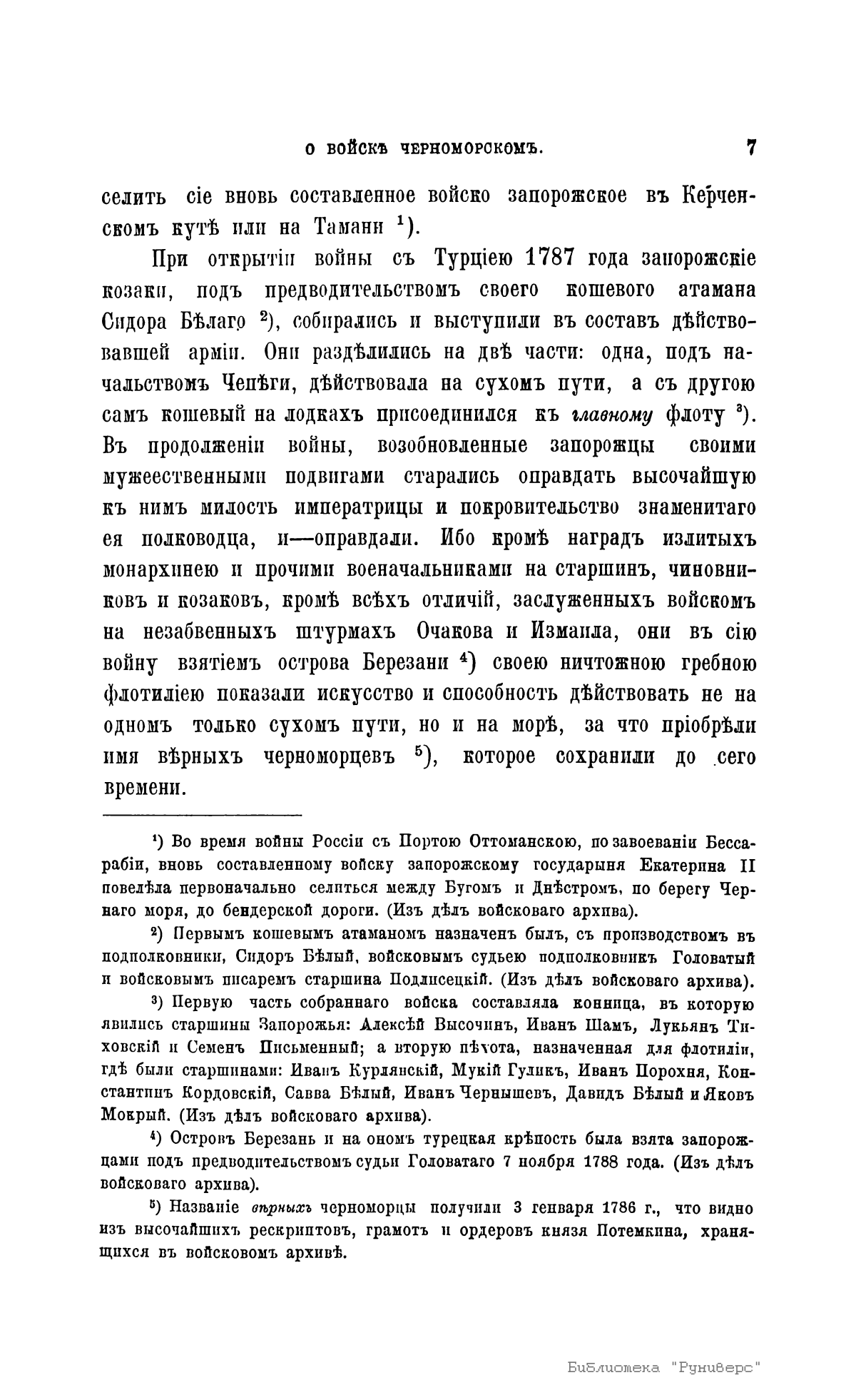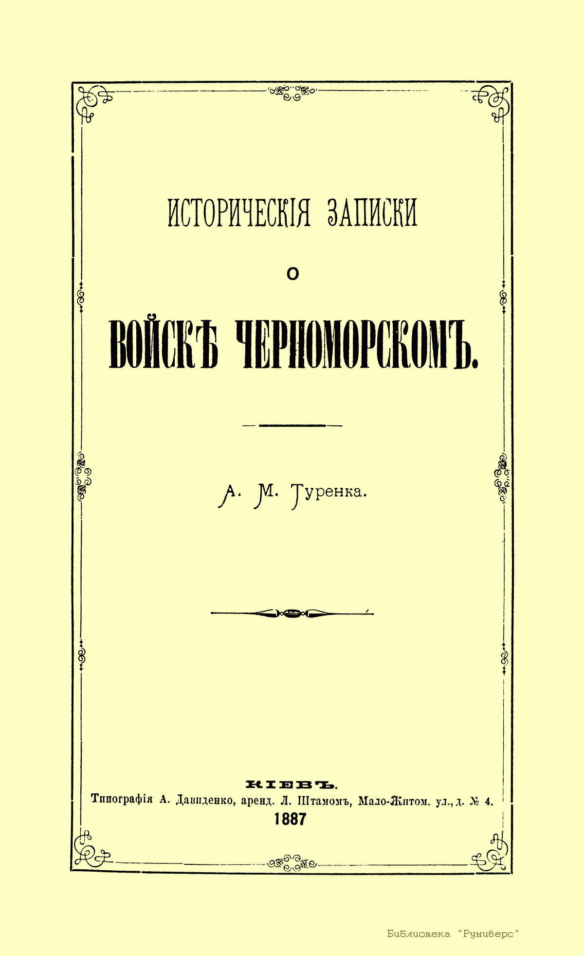 Кавалер Александр Михайлович Туренка описывает историю войска черноморского 2-го конно-казачьего полка с 1787-го по 1831 г. Войско образовано 3 июля 1787 г. В этот день старшины бывшего запорожского войска Сидор Белый, Антон Головатый, Захарий Чепига и др. в Кременчуге получили от проезжавшей по Малороссии императрицы Екатерины в ответ на поднесенное ей прошение именной указ на новое возрождение запорожского войска и временного поселения между рр. Днестром и Бугом. В 1814 г. возрожденное войско заняло Кубанскую область, собственно Черноморию, по правому берегу р. Кубани.
