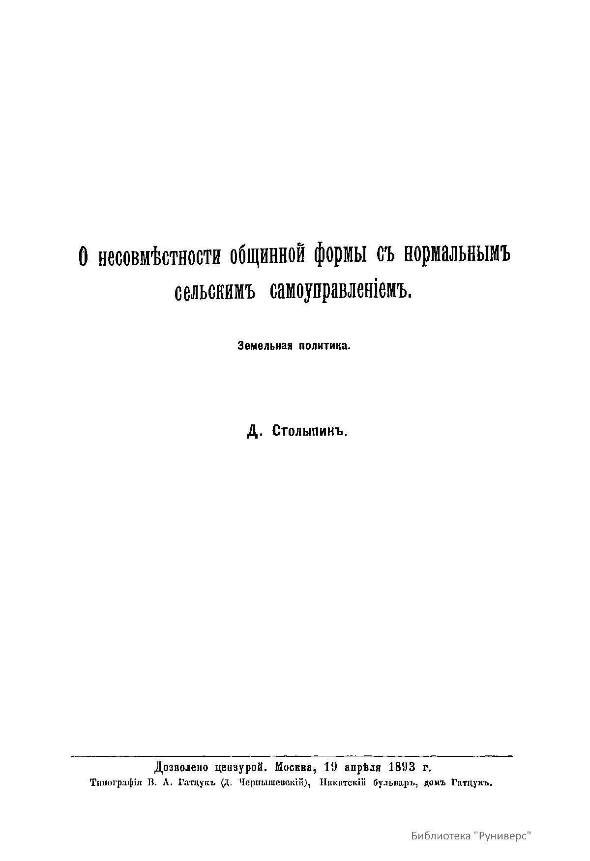 О несовмѣстности общинной формы съ нормальнымъ сельскимъ самоуправленiемъ