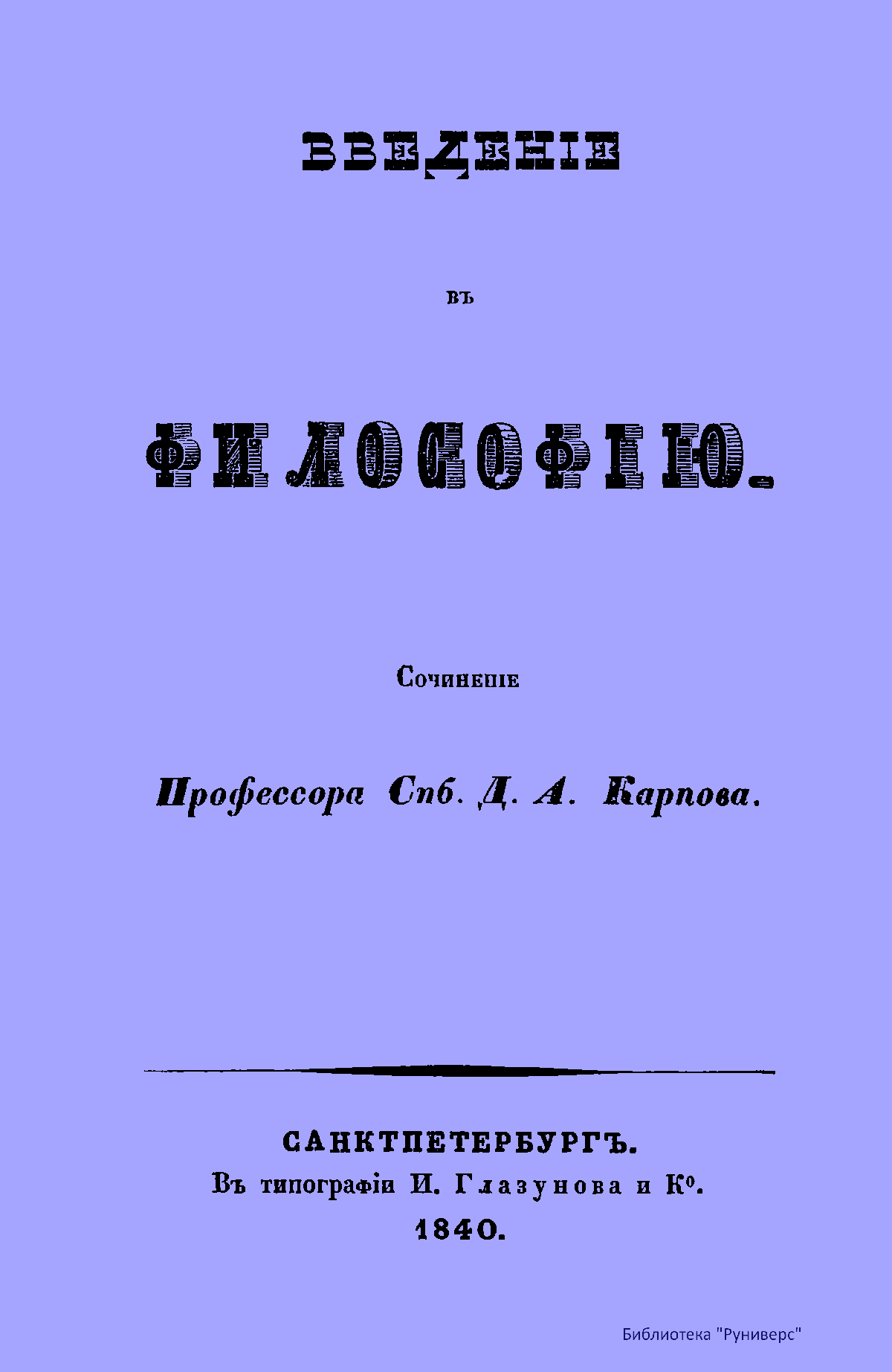 «Предлагаемое теперь читателям «Введение в философию» заключает в себе мои мысли вообше о философии и об образе систематического ее развития», — писал автор в предисловии к своему сочинению. «Старость не за горами, жизнь коротка и конец ее неизвестен: пора, кажется, позаботиться и об отчете, и оправдаться даже пред теми людьми, которые судят о науке и ученых только по печатным документам», — так обращался В.Н. Карпов к своим читателям. На страницах ряда журналов появились отзывы, авторы которых рекомендовали читателям ознакомиться с этим философским трактатом. «Введение в философию» г. Карпова представляет утешительное явление по тому уже одному, что автор, как видно из целой книги, занимается своим предметом с уважением, что для него философия не игрушка, как у большей части наших доморощенных философов, и что он не шутя старается определить, в чем она заключается», — отмечал Виссарион Белинский, опубликовавший в «Отечественных записках»