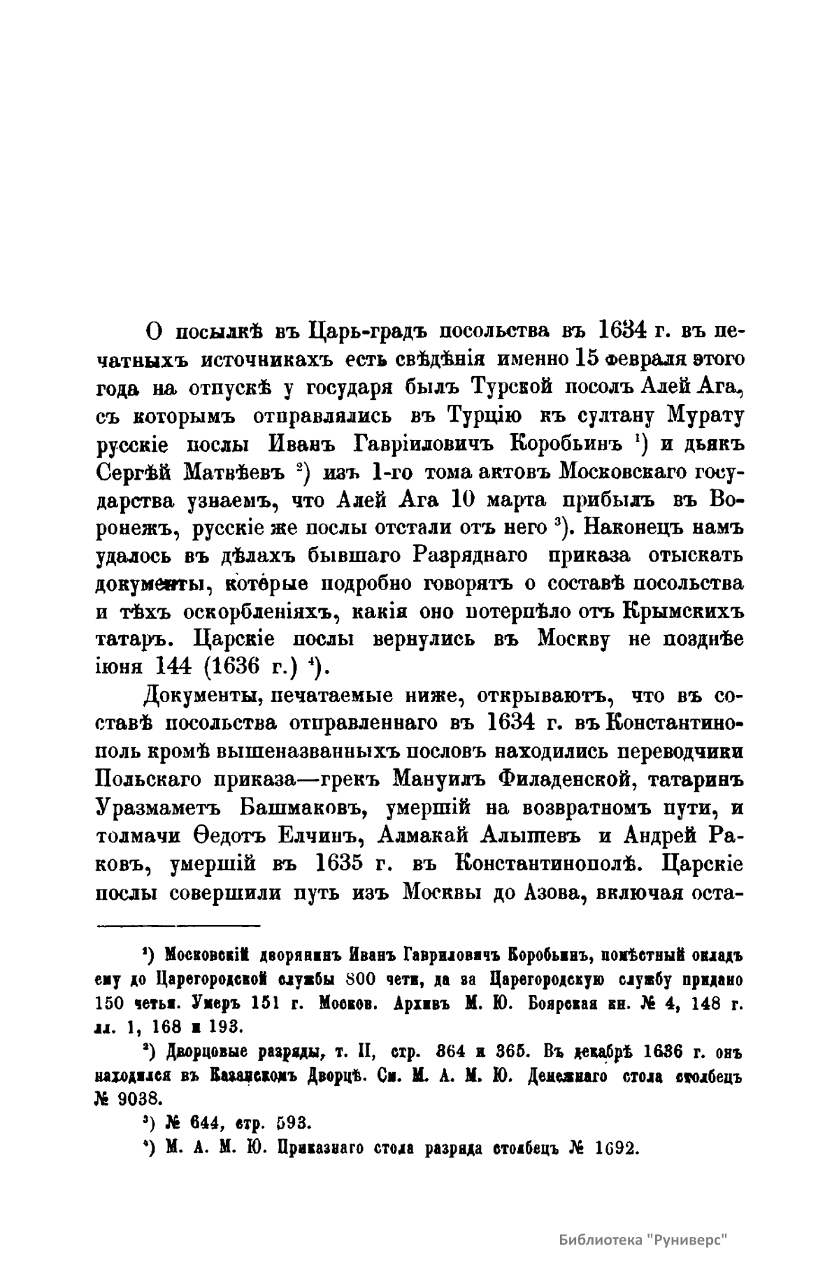 В брошюре опубликованы документы, освещающие посольство 1634 г. в Константинополь к султану Мурату в составе: турецкого посла Алей Аги, русских послов Ивана Гавриловича Коробьина и дьяка Сергея Матвеева, переводчиков Польского приказа: грека Мануила Филаденского, татарина Уразмамета Башмакова, умершего на обратном пути, и толмачей: Федота Елчина, Алмакая Алытева, Андрея Ракова, умершего в 1635 г. в Константинополе. Царские послы совершили путь из Москвы до Азова, где остановились на 17 недель. В Константинополе у султана они пробыли два месяца и выехали в Крым, где терпели тяжкие оскорбления за то, что государь «помирился с литовским королем». В документах живо показано тяжелое положение русских дипломатов XVII века, которые рисковали жизнью среди диких орд, не признававших никаких международных отношений и знавших одно только право сильного.