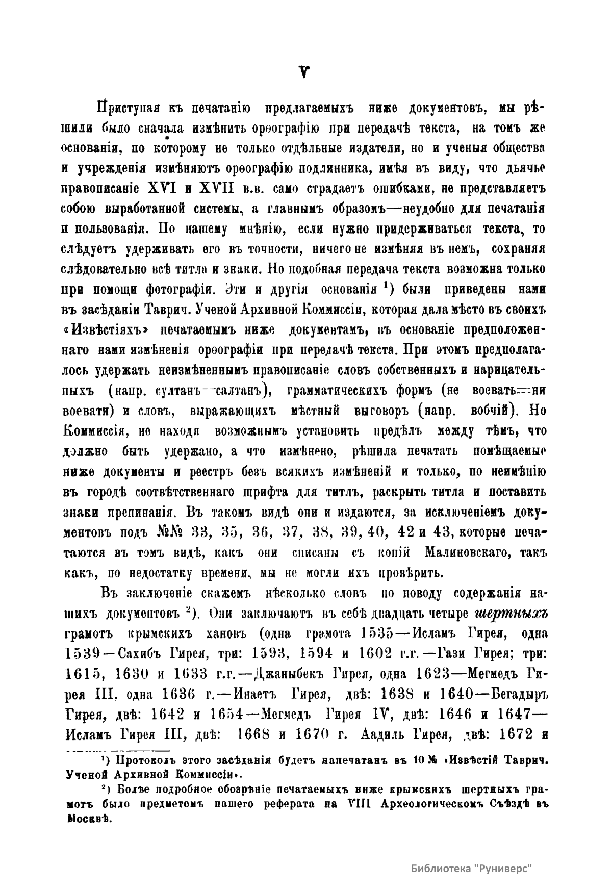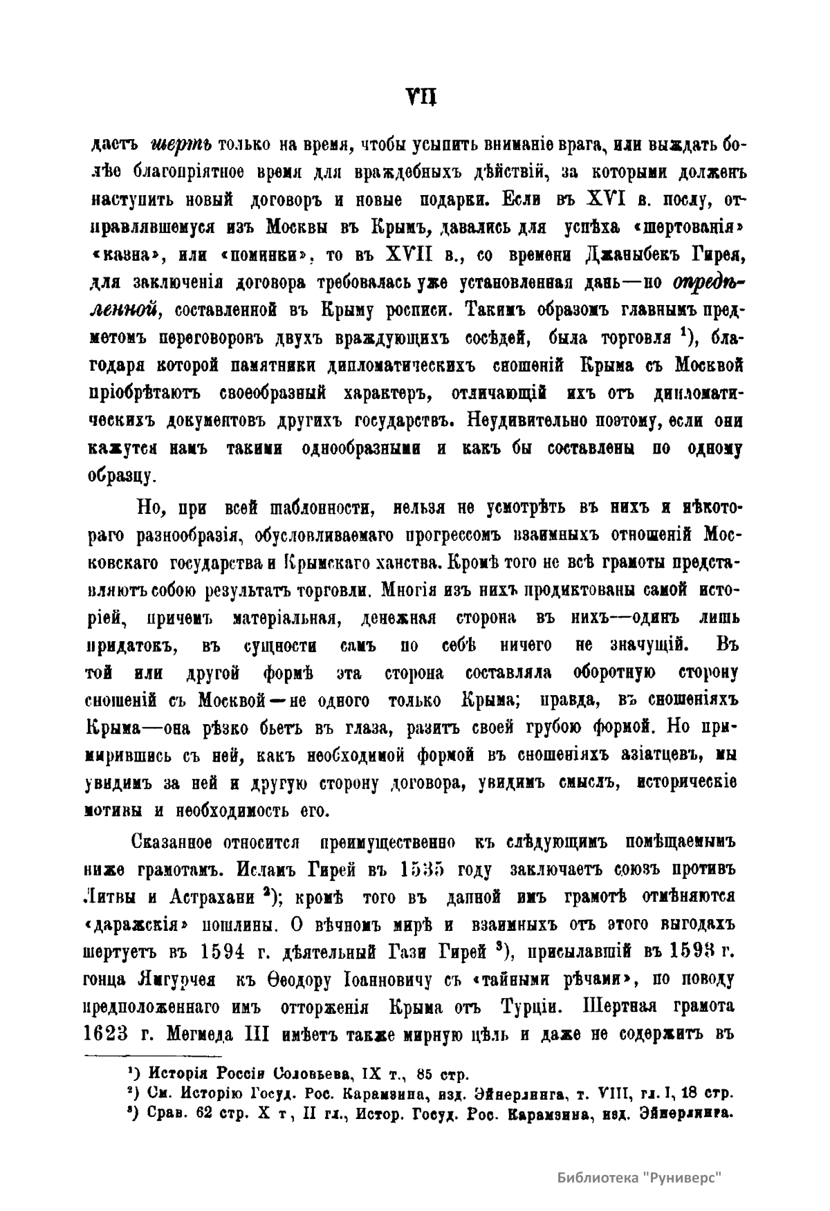 В настоящем издании опубликованы памятники дипломатических сношений Крымского ханства с Московским государством в XVI и XVII вв., хранившиеся в Московском главном архиве министерства иностранных дел. Большинство документов составляют шертные, или договорные, грамоты крымских ханов и записи их послов. Отношения между Крымским ханством и Московским государством не были мирные. Эти отношения и определяют характер договоров. С одной стороны, Московское государство старается задобрить хана и отправляет к нему посла, который, пользуясь неблагоприятными для Крыма обстоятельствами, а большей частью путем задаривания хана и его приближенных, получает от него шертную грамоту. В ней хан обязывается за себя и «за весь крымский юрт» «быть в союзе, любви и дружбе», «быть заодно против недругов московского государя», «не воевать русских украинных городов», «давать свободный проезд купцам» и т.д. С другой стороны, Крым дает шерт только на время, чтобы усыпить внимание врага или выждать более благоприятное время для враждебных действий, за которыми должен наступить новый договор и новые подарки. Таким образом главным предметом переговоров враждующих соседей была торговля, благодаря которой памятники дипломатических сношений Крыма с Москвой приобретают своеобразный характер, отличающий их от дипломатических документов других государств.