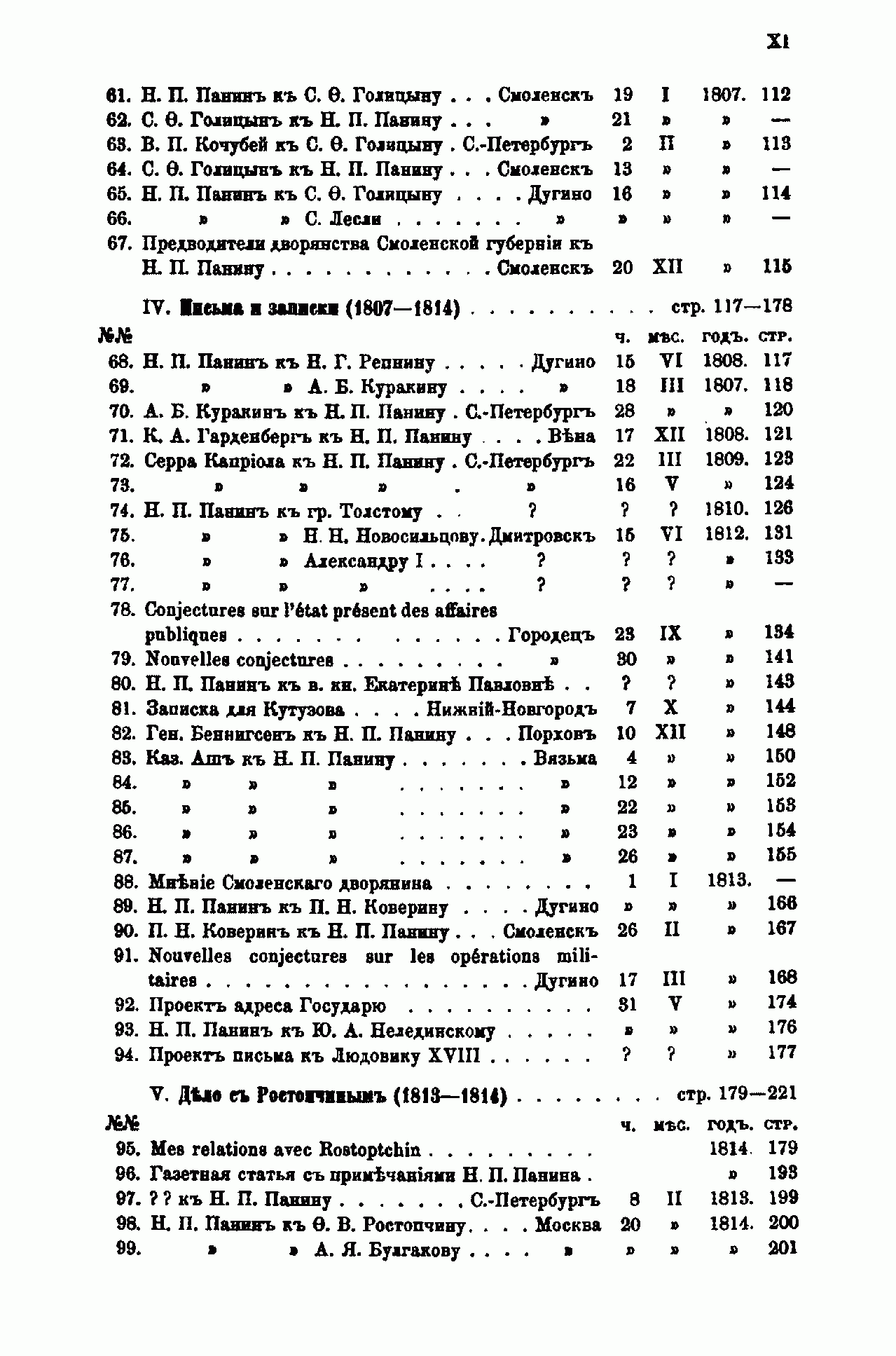 По поручению внучки Н. П. Панина, княгини М. А. Мещерской, А. Г. Брикнер с 1886 г. начал собирать и публиковать материалы для биографии графа. Последний, седьмой, том материалов посвящён частной жизни Панина с 1802 г. до его кончины в 1837 г. Здесь собраны сведения о путешествии графа в Финляндию в 1802 г.; о путешествии по Европе и окончательной опале (1802 – 1804); об участии в устройстве ополчения в Смоленской губернии (1806 – 1807); о деле с Ростопчиным (1813 – 1814); о жизни в Дугине (1816 – 1837), а также различные письма и записки. Большая часть документов написана по-французски.