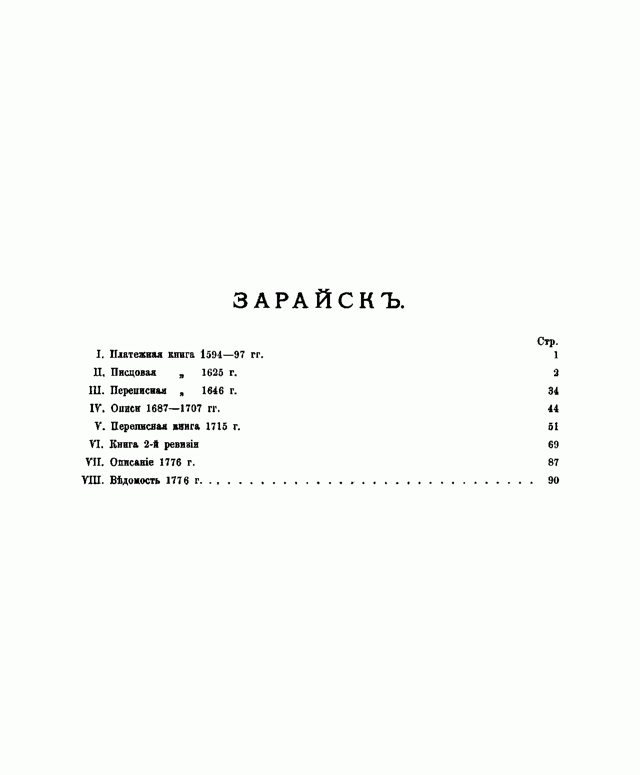 Публикация документов XVI – XVIII вв. осуществлена на средства московских купцов Бахрушиных и Сорокоумовского, род которых происходил из города Зарайска. В книге представлены: платёжная книга 1591 – 1597 гг., писцовая книга 1625 г., переписная книга 1646 г., описи 1687 – 1707 гг., переписная книга 1715 г., книга 2-й ревизии, ведомость 1776 г. Особый интерес представляет описание города и уезда 1776 года, которое позволяет читателю погрузиться в атмосферу того далёкого времени.