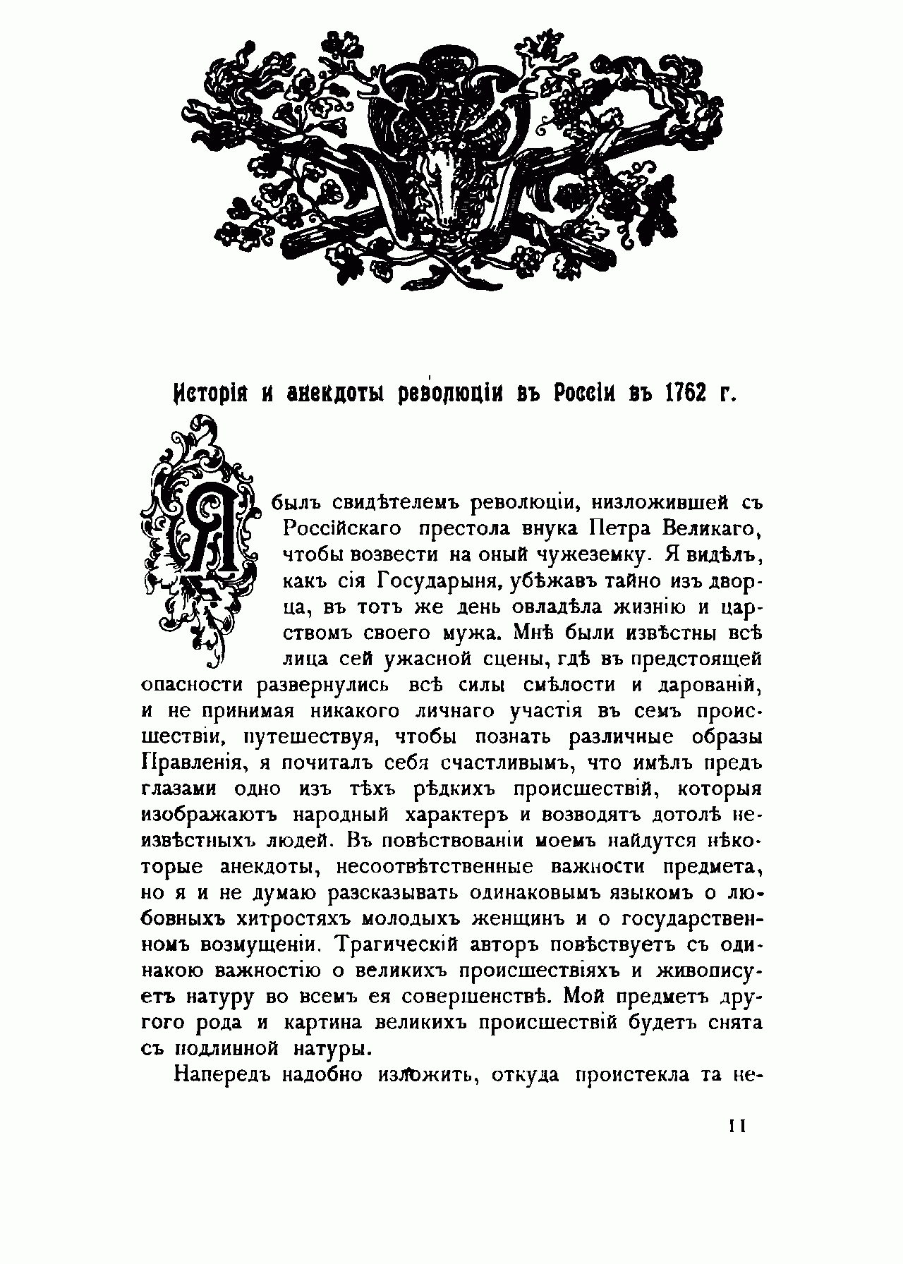 Публикация сочинения секретаря французского посла в России Рюльера о ходе подготовки и осуществлении дворцового переворота 1762 г., приведшая на трон Екатерину II, дополненная многочисленными письмами и воспоминаниями современников. Это издание имело огромную популярность.