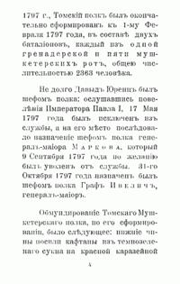 Полковая хроника составлена в связи с празднованием 100-летия 39-го Томского пехотного полка. Двухбатальонный Томский мушкетерский полк был сформирован 29 ноября 1796 года в Томске из Екатеринбургского и Семипалатинского полевых батальонов. Летом 1808 г. полк навсегда покинул Томскую губернию и был переведен в Омск, откуда вместе с остальными сибирскими полками начал длительный поход на запад – в Волынскую губернию, куда прибыл в сентябре 1809 г. С тех пор он постоянно дислоцировался на западных рубежах России. За долгие годы своей истории полк принимал активное участие в Отечественной войне 1812 года, русско-турецкой войне 1828–1829 г., в венгерском (1849 г.) и польском (1863 г.) походах, внёс большой вклад в оборону Севастополя в ходе Крымской войны. С 1864 г. несколько раз менял свою дислокацию в юго-западных областях России, однако участия в боевых действиях вплоть до Первой мировой войны не принимал.