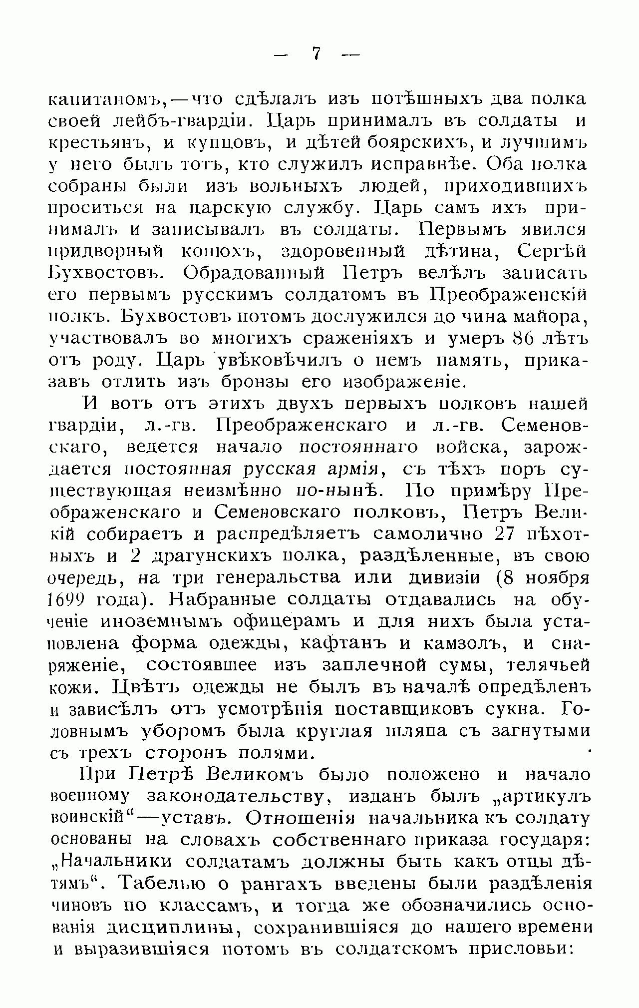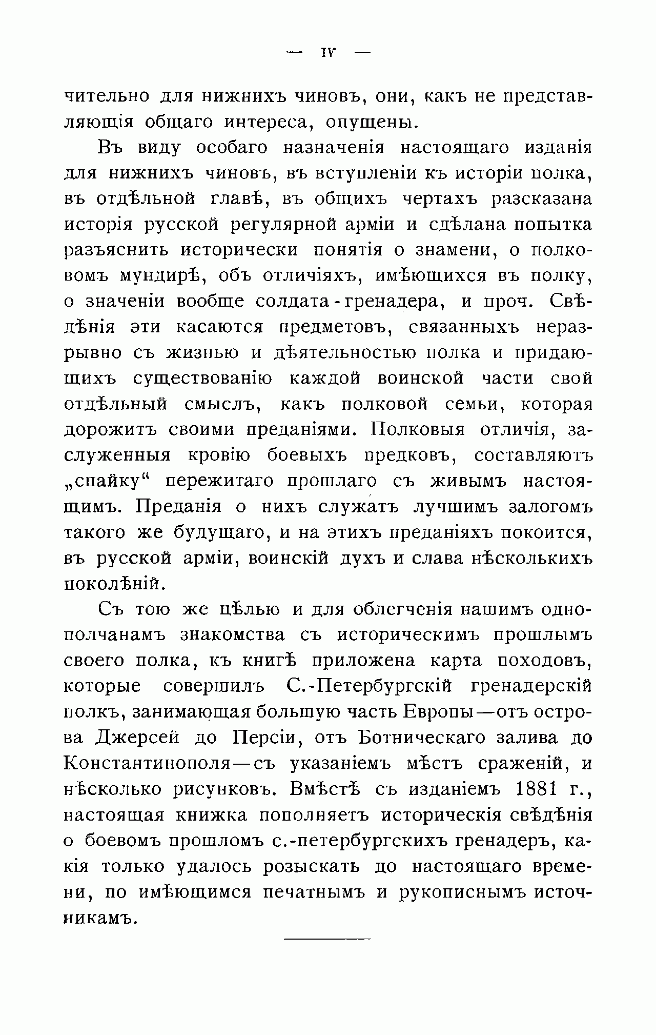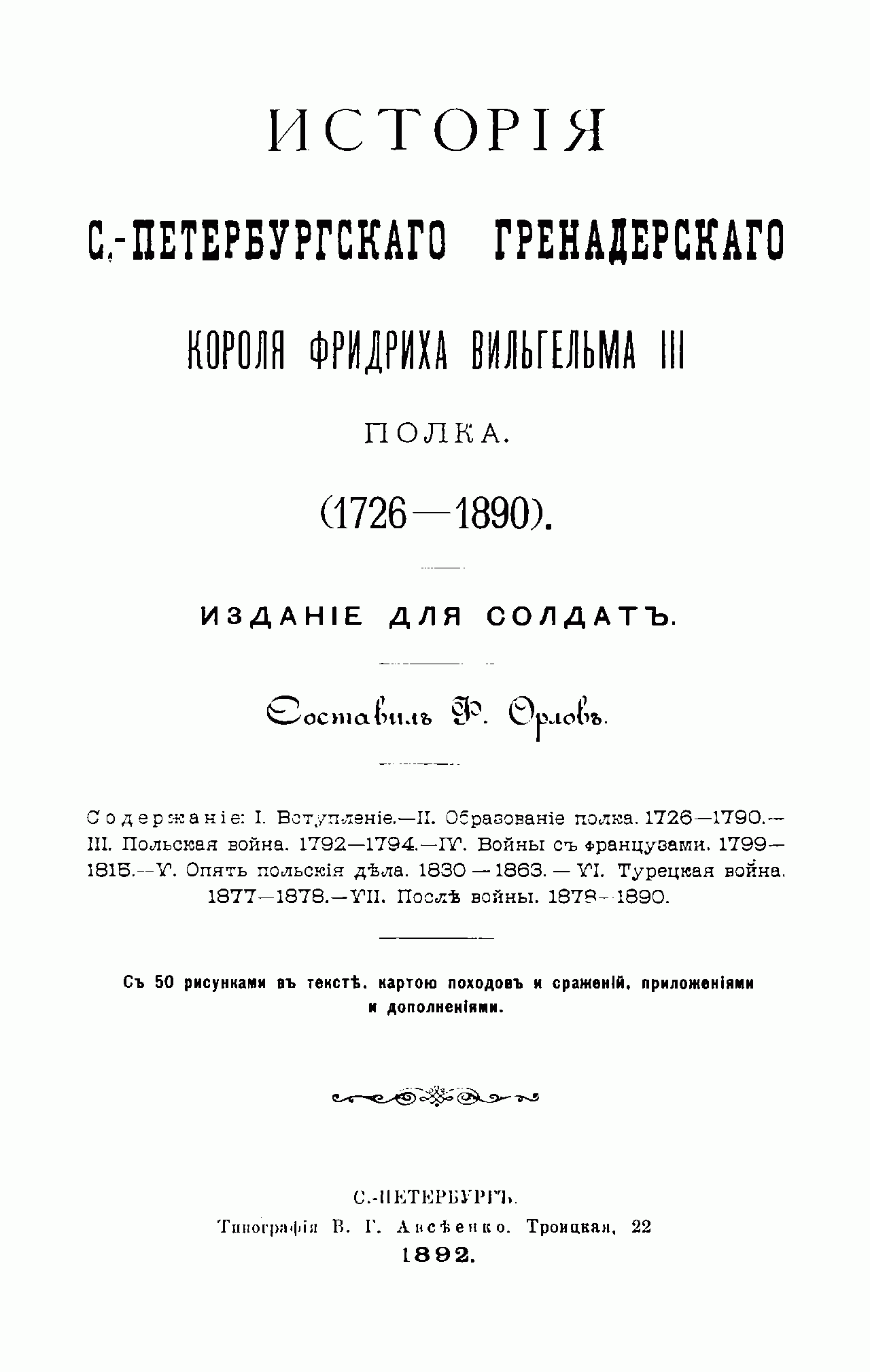Данное издание представляет собой сжатый, популярный очерк истории Санкт-Петербургского гренадерского короля Фридриха Вильгельма III-го полка, подготовленный генералом Ф.Ф. Орловым для нижних чинов, написанный им на базе изданной за десять лет до этого подробной полковой истории. Создание этого полка связано с продвижением российских войск в Прикаспии и проведением Персидского похода в конце царствования Петра Великого. В 1726 г. было приказано в так называемом «Низовом корпусе» сформировать именной фон Лукиева полк в составе 1 гренадерской и 7 фузелерных рот. В дальнейшем полк неоднократно переименовывался и носил имена своих командиров. Однако, с 1801 г. он стал носить название Санкт-Петербургский, а после заграничных походов и разгрома Наполеона в Европе, полку было присвоено почётное имя  короля Прусского, а затем он был причислен к лейб-гвардии.