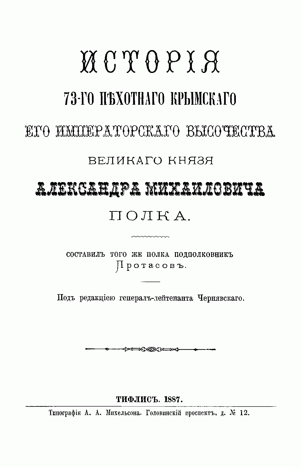 Исторiя 73-го Пѣхотнаго Крымскаго Его Императорскаго Высочества великаго князя Александра Михайловича полка