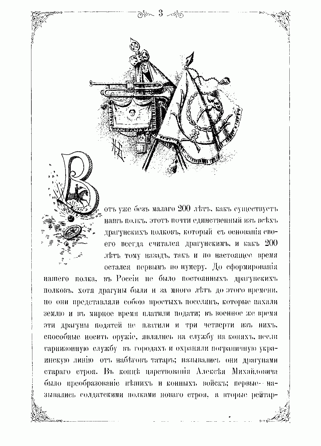 Краткая история Лейб-драгунского Его Величества полка была составлена полковым адъютантом штабс-ротмистром С.П. Шебякиным специально для проведения занятий с нижними чинами. Этот полк по праву считался в Российской императорской армии одним из старейших. История его формирования восходит к царствованию Алексея Михайловича, когда в русских войсках впервые начали создаваться драгунские полки. Старшинство полка относится к февралю 1700 г., когда это формирование создавалось по воле Петра Великого в селе Преображенском и сначала получило наименование «Преображенский драгунский полк», а затем «драгунский генерала А.А. Вейде полк». Фактически сразу же после своего создания драгуны полка были приравнены к двум первым гвардейским полкам пехоты, положив начало созданию гвардейской кавалерии. Однако до конца XVIII в. полк назывался исключительно по именам своих командиров и шефов. Только в XIX столетии, в царствование Александра II полк получил наименование «лейб-драгунский Московский Его Величества». Боевой путь полка изложен автором до предела кратко, и представлен очерками по его почти 200-летней истории, разбитыми по царствованиям российских подготовленной для воспитательной работы с личным составом. императоров.