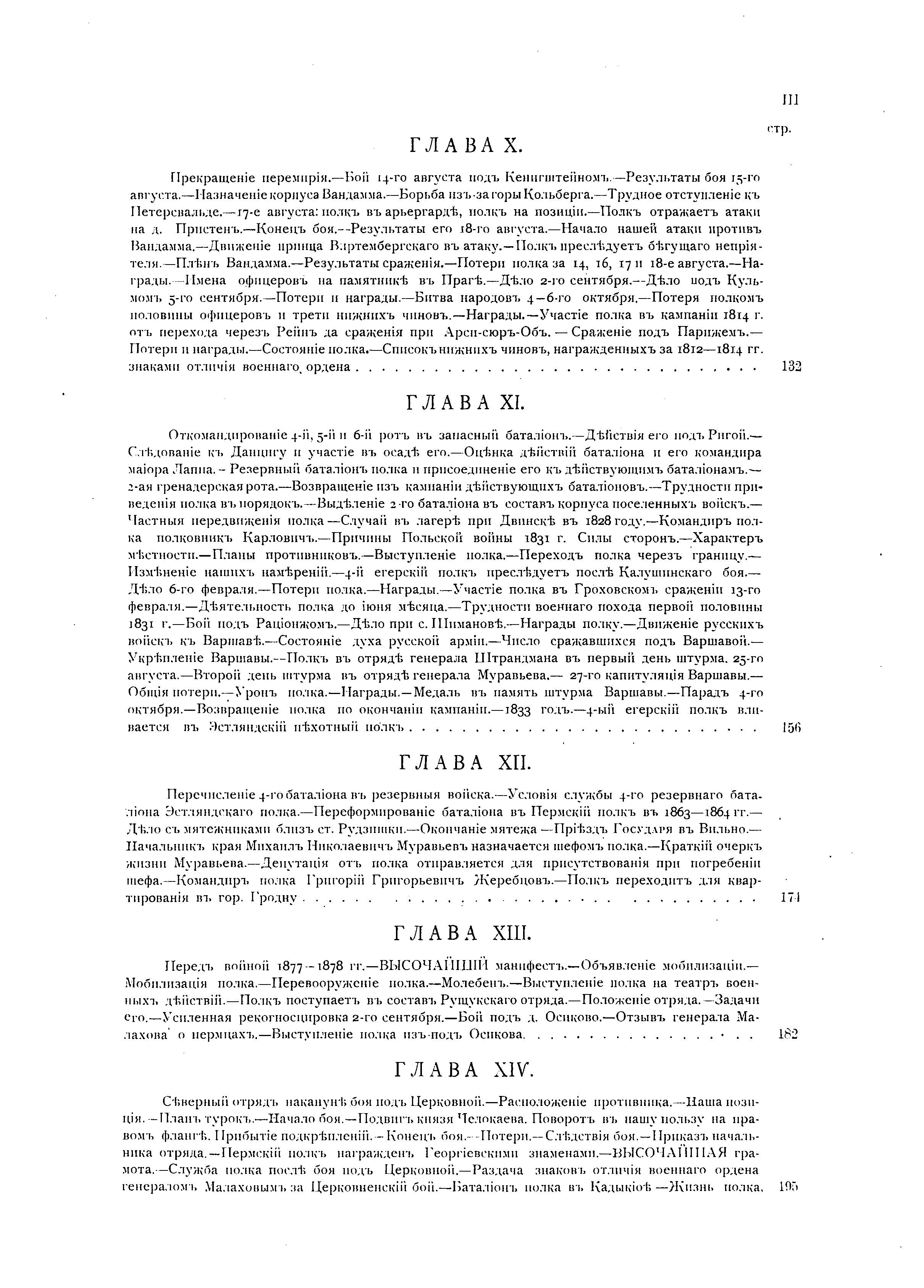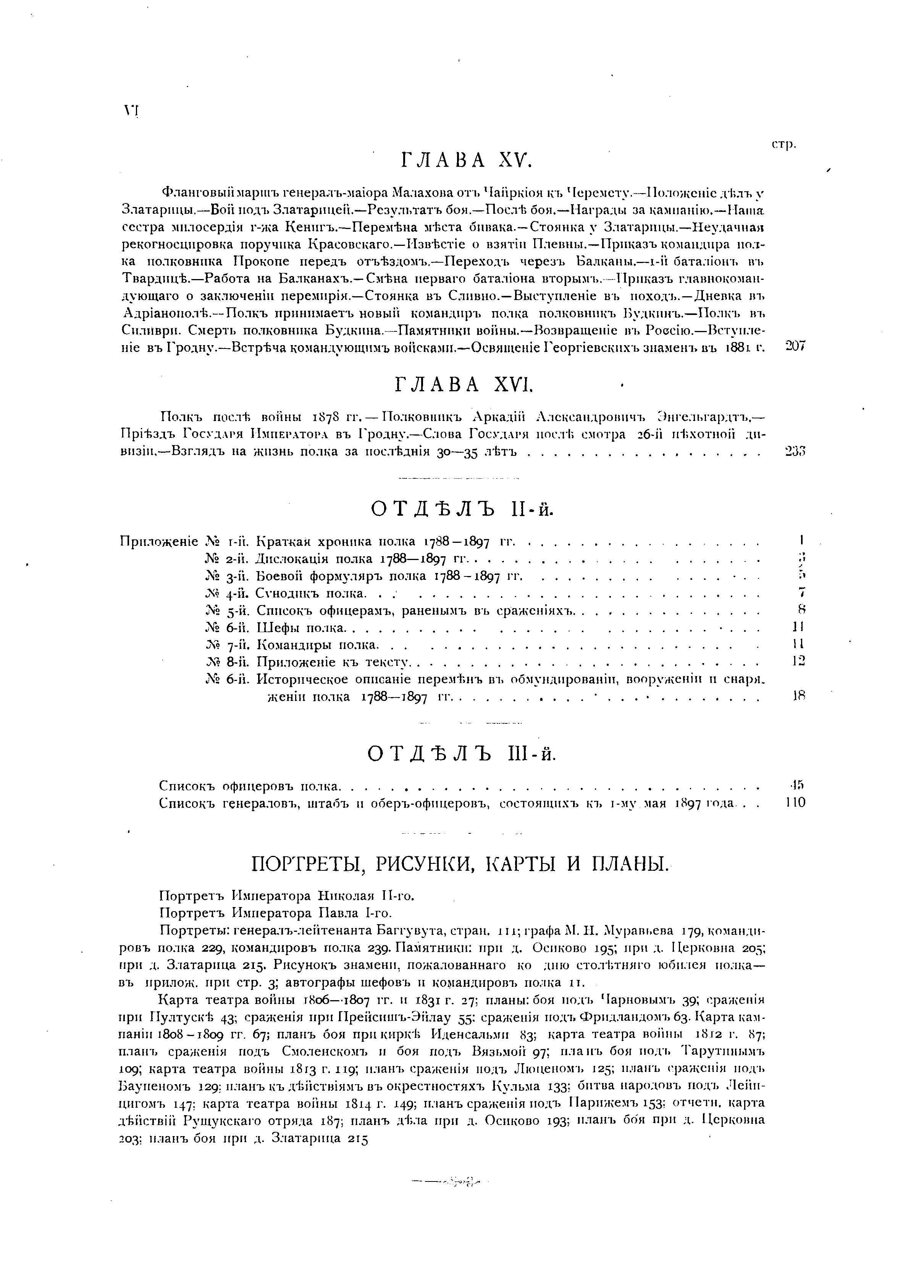 Документальное описание боевых действий полка и знаменательных исторических событий, связанных с ним, за период 1788 – 1897 годов. Приведены поименные полковые списки личного состава, списки награжденных и отличившихся в разных кампаниях (с указанием наград), списки шефов, командиров и офицеров полка, боевой формуляр полка, подробное описание обмундирования, вооружения, снаряжения и т.п.