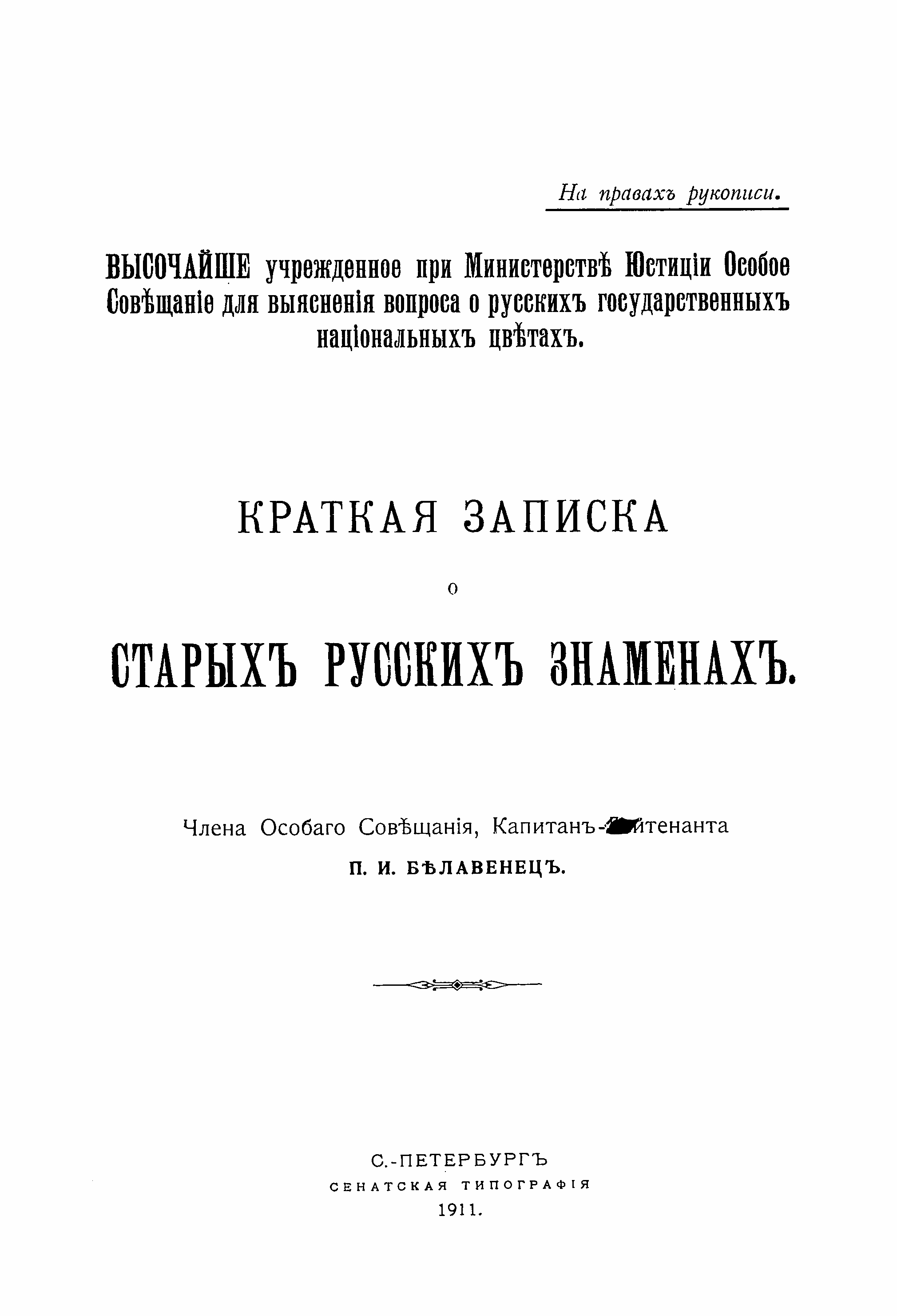 Краткий популярный очерк известного специалиста по военной и военно-морской истории России посвящен описанию знамён, начиная с хоругвей и стягов времён великого князя Дмитрия Донского (в XIV в.) до знамён, принятых в полках Российской императорской армии в эпоху Александра I. В брошюре приведено описание более 320 русских знамён различных периодов российской истории, особое внимание сосредоточено на знамёнах петровского времени. В правление последнего российского императора Николая II в придворных кругах широко обсуждалась проблема национальных цветов. Капитан-лейтенант Белавенец П.И, являясь членом Особого совещания при Министерстве юстиции для выяснения вопроса о русских государственных национальных цветах в 1910-1912 гг., весьма плодотворно занимался геральдикой, историей знамен и флагов. В ходе работы Совещания, и в печати велась острая полемика между сторонниками бело-сине-красного и черно-золото-белого флагов. Сторонниками первого был П.И. Белавенец, доставивший бело-сине-красное знамя Петра Великого, хранившееся в Архангельске и собравший сведения о русских знаменах, захваченных шведами под Нарвой, переиздавший и прокомментировавший книгу К. Алярда о флагах (Амстердам, 1695; Москва, 1709), а затем составивший специальную записку о русских знаменах. Результатом этой деятельности и стало данное издание.