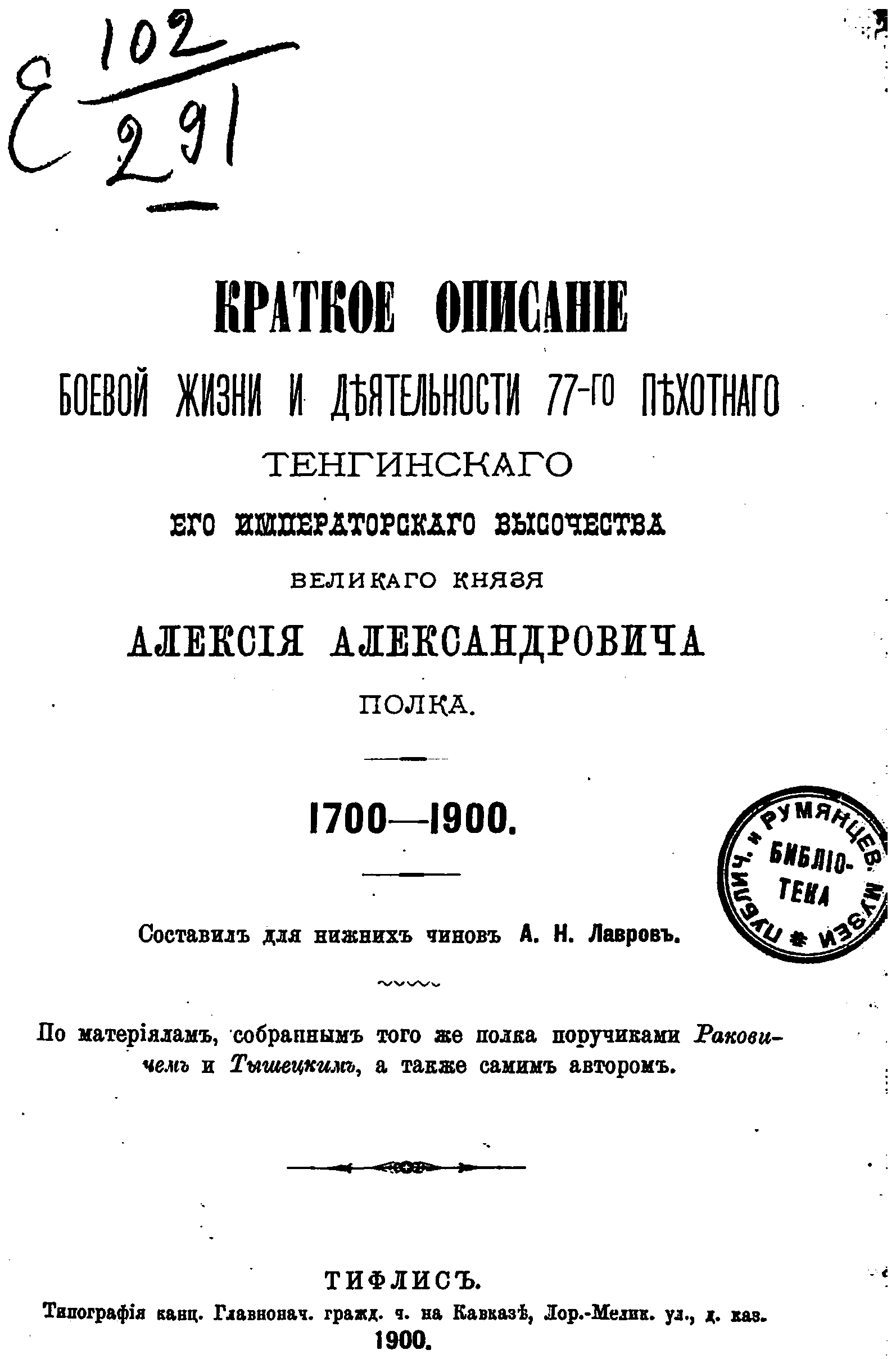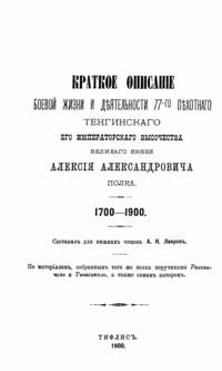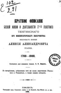 Краткое описанiе боевой жизни и дѣятельности 77-го пехотнаго Тенгинскаго Его Императорскаго Высочества Великаго Князя Алексiя Александровича полка. 1700-1900