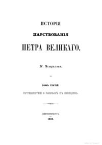 Устрялов Николай Герасимович (1805–1870) — профессор Петербургского университета, академик Императорской Академии наук. Самым важным трудом, которому Устрялов посвятил последние 23 года жизни, была «История царствования Петра Великого». Для ее создания автор использовал множество важных источников из государственного архива. Его труд остался незаконченным, но, несмотря на это, явился крупнейшим историческим исследованием.