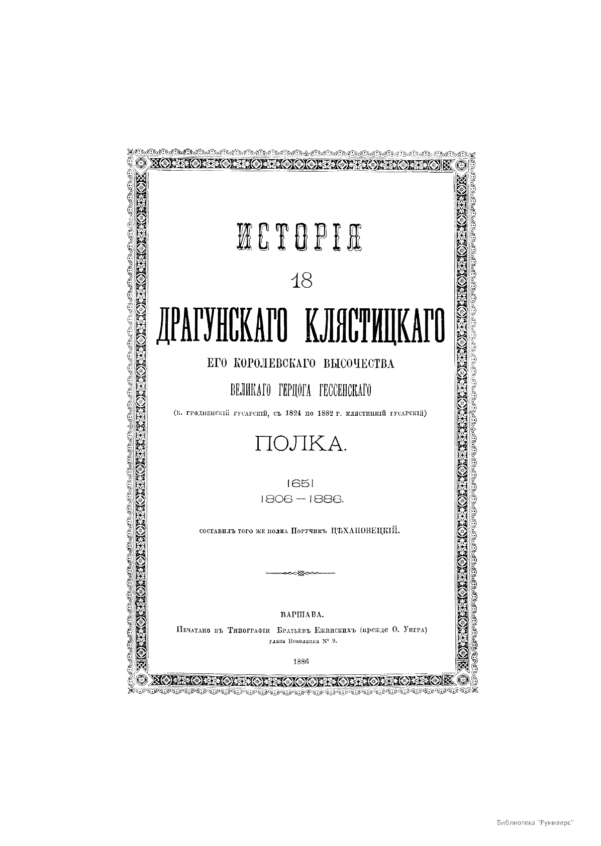 В 1886 г. в Варшаве, входившей в то время в состав Российской империи, вышла в свет книга поручика В. П. Цехановецкого, посвященная истории 18-го драгунского Клястицкого полка. Клястицкий полк был сформирован в г. Торопце Псковской губернии в июне 1806 г. под названием Гродненского гусарского полка. Боевое крещение полк получил уже через полгода: в январе 1807 г. в сражении при Прейсиш-Эйлау. Зимой 1808–1809 гг. полк совершил беспримерный поход в Швецию по льду Ботнического залива. В Отечественной войне 1812 г. Гродненский гусарский полк заслужил две почетные коллективные награды: серебряные трубы с памятной надписью и знаки на кивера «За отличие».
