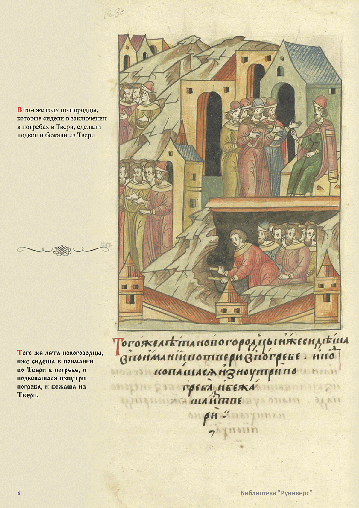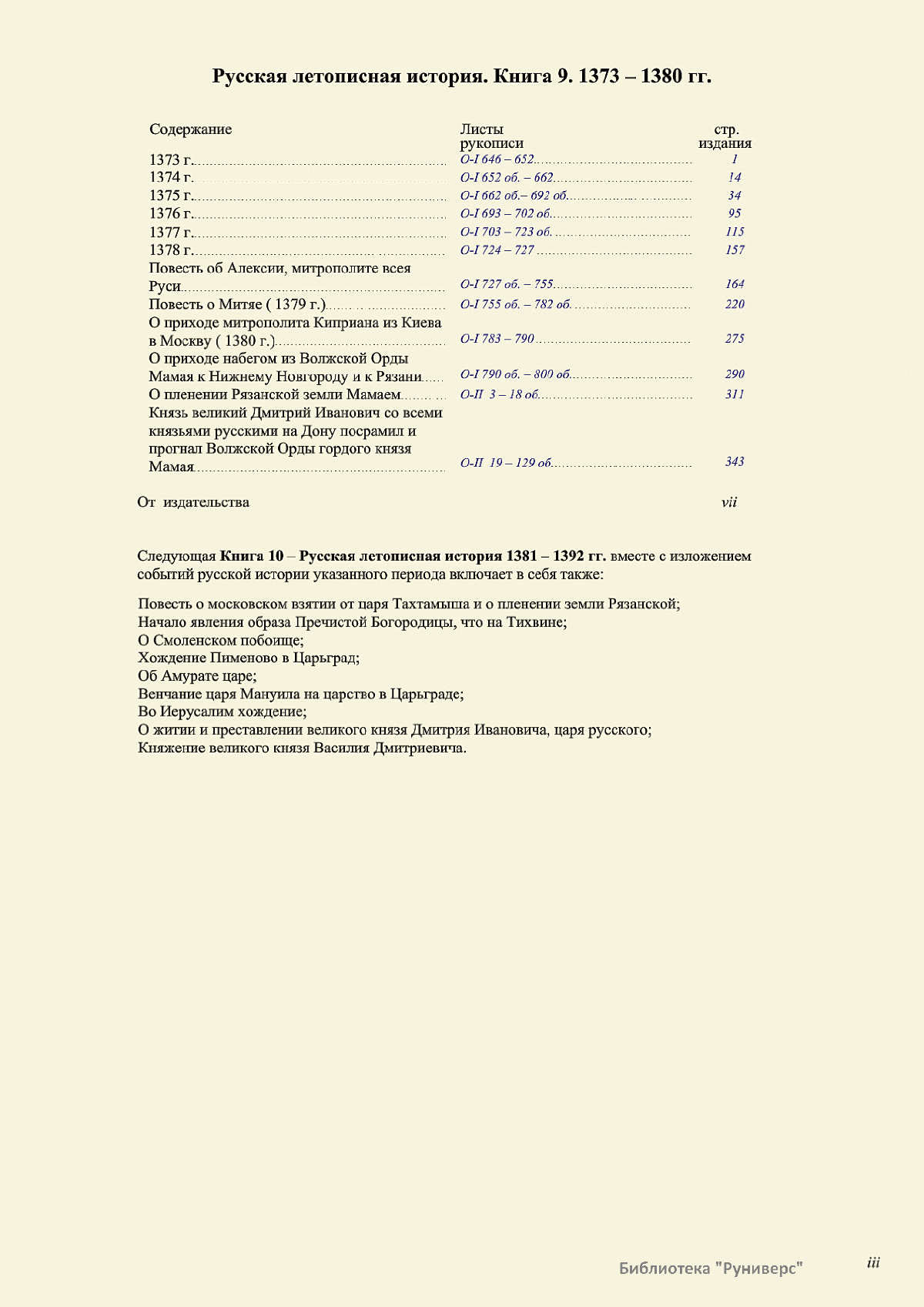 Лицевой летописный свод. XVI века — монументальный памятник древнерусского книжного искусства. На 10 тысячах листов с более чем 17 тысячами красочных миниатюр — «окон в историю» — представлена самая ранняя историческая и литературная энциклопедия. Лицевой свод дошел до наших дней в 10 томах, находящихся в разных древлехранилищах: БАН к РНБ в Санкт-Петербурге и ГИМ в Москве. Фирма «АКТЕОН» совместно с хранителями впервые осуществила научное факсимильное издание «Лицевой летописный свод XVI века». Предлагаемое издание с переводом — как дополнение в рамках научного аппарата вышеназванного факсимиле - представлено тремя разделами: библейская история, всемирная история, русская летописная история. В настоящем издании листы расположены в хронологическом порядке повествования На внешнем поле размещены транслитерация и перевод на современный русский язык. Русская летописная история 1114—1567 гг. — отражена на 6010 Лицевого летописного свода XVI века в следующих его томах: Г — Голицынский том (Отдел рукописей Российский национальной библиотеки, F.IV.225), Л — Лаптевский TOM (Отдел рукописей Российской национальной библиотеки, F.IV.233), O-I — Остермановский первый том (Отдел рукописей Библиотеки Академии наук, 31. 7. 30-1), O-II — Остермановский второй той (Отдел рукописей Библиотеки Академии наук, 31, 7. 30-2), Ш — Шумиловский том (Отдел рукописей Российской национальной библиотеки, F, IY. 232), С — Синодальный том (Отдел рукописей Государственного Исторического музея. Син. № 962), Ц— Царственная книга (Отдел рукописей Государственного Историческою музея. Син. № 149). В сносках отряжены разночтения с перепей ПСРЛ — Полным собранием русских летописей - фундаментальной для изучения истории древней и средневековой Руси книжной серией (её тексты, в основном, издавались наборно, в орфографии XIX века).