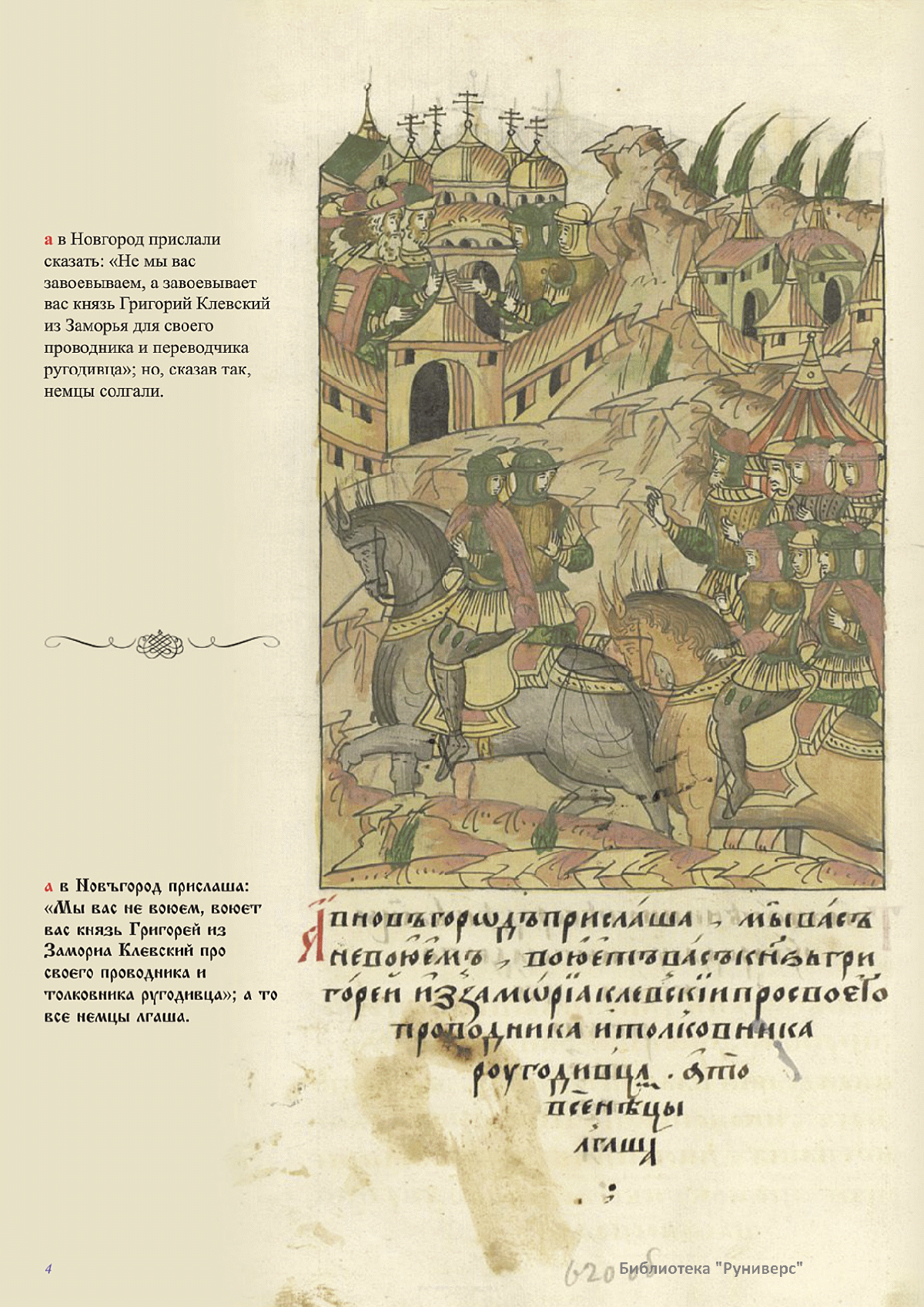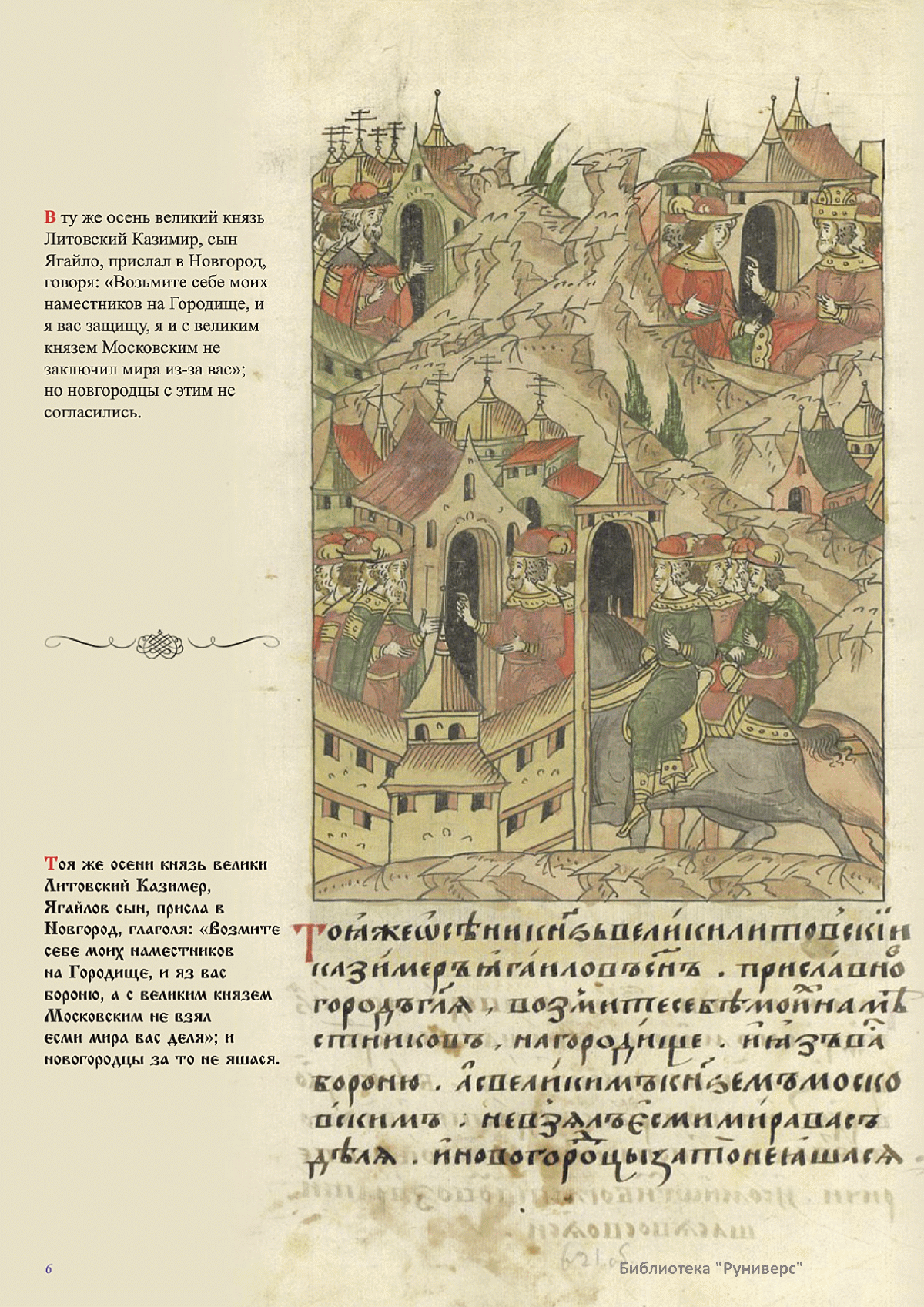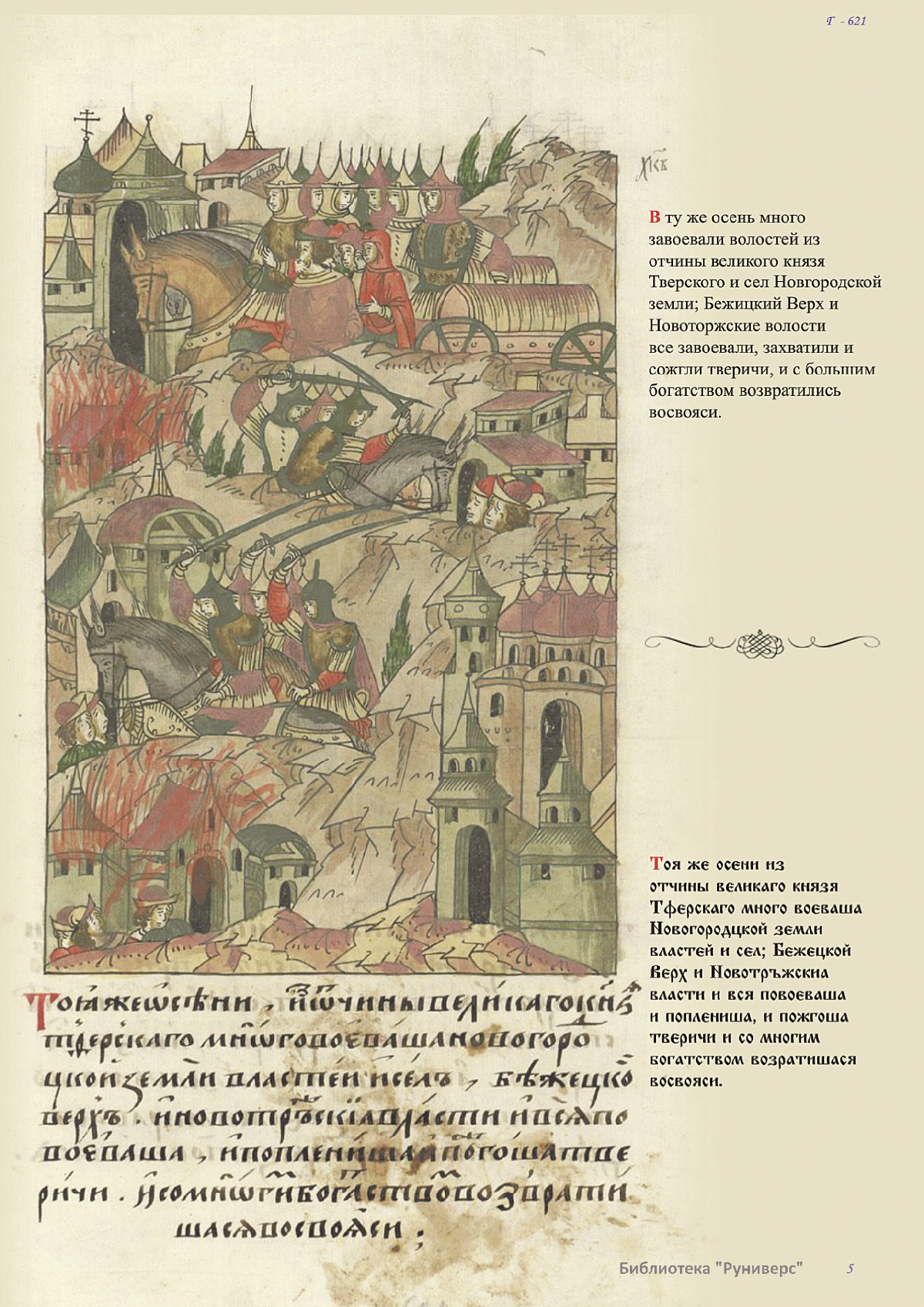 Лицевой летописный свод. XVI века — монументальный памятник древнерусского книжного искусства. На 10 тысячах листов с более чем 17 тысячами красочных миниатюр — «окон в историю» — представлена самая ранняя историческая и литературная энциклопедия. Лицевой свод дошел до наших дней в 10 томах, находящихся в разных древлехранилищах: БАН к РНБ в Санкт-Петербурге и ГИМ в Москве. Фирма «АКТЕОН» совместно с хранителями впервые осуществила научное факсимильное издание «Лицевой летописный свод XVI века». Предлагаемое издание с переводом — как дополнение в рамках научного аппарата вышеназванного факсимиле - представлено тремя разделами: библейская история, всемирная история, русская летописная история. В настоящем издании листы расположены в хронологическом порядке повествования На внешнем поле размещены транслитерация и перевод на современный русский язык. Русская летописная история 1114—1567 гг. — отражена на 6010 Лицевого летописного свода XVI века в следующих его томах: Г — Голицынский том (Отдел рукописей Российский национальной библиотеки, F.IV.225), Л — Лаптевский TOM (Отдел рукописей Российской национальной библиотеки, F.IV.233), O-I — Остермановский первый том (Отдел рукописей Библиотеки Академии наук, 31. 7. 30-1), O-II — Остермановский второй той (Отдел рукописей Библиотеки Академии наук, 31, 7. 30-2), Ш — Шумиловский том (Отдел рукописей Российской национальной библиотеки, F, IY. 232), С — Синодальный том (Отдел рукописей Государственного Исторического музея. Син. № 962), Ц— Царственная книга (Отдел рукописей Государственного Историческою музея. Син. № 149). В сносках отряжены разночтения с перепей ПСРЛ — Полным собранием русских летописей - фундаментальной для изучения истории древней и средневековой Руси книжной серией (её тексты, в основном, издавались наборно, в орфографии XIX века).