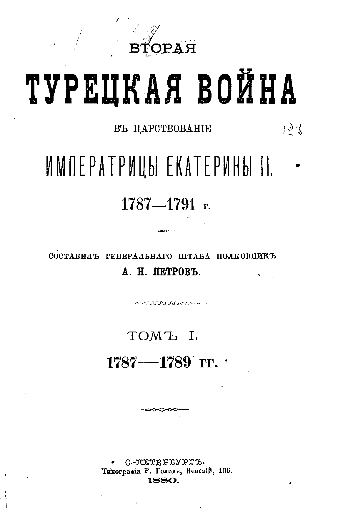 Андрей Николаевич Петров взялся за описание второй екатерининской войны с Турцией 1787 — 1791 гг., уже хорошо изучив саму эпоху по своим предыдущим работам.