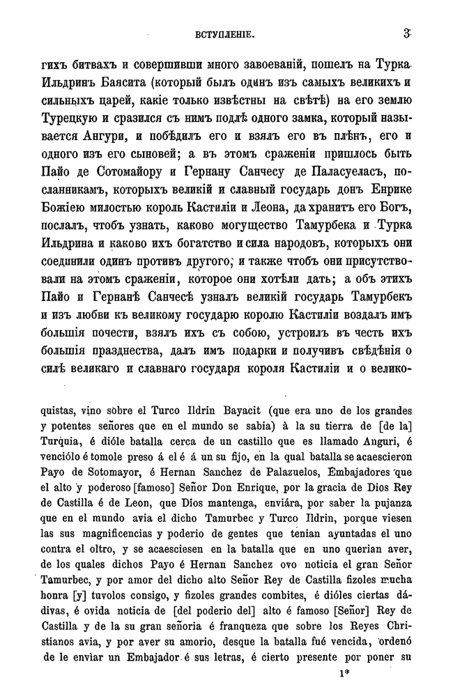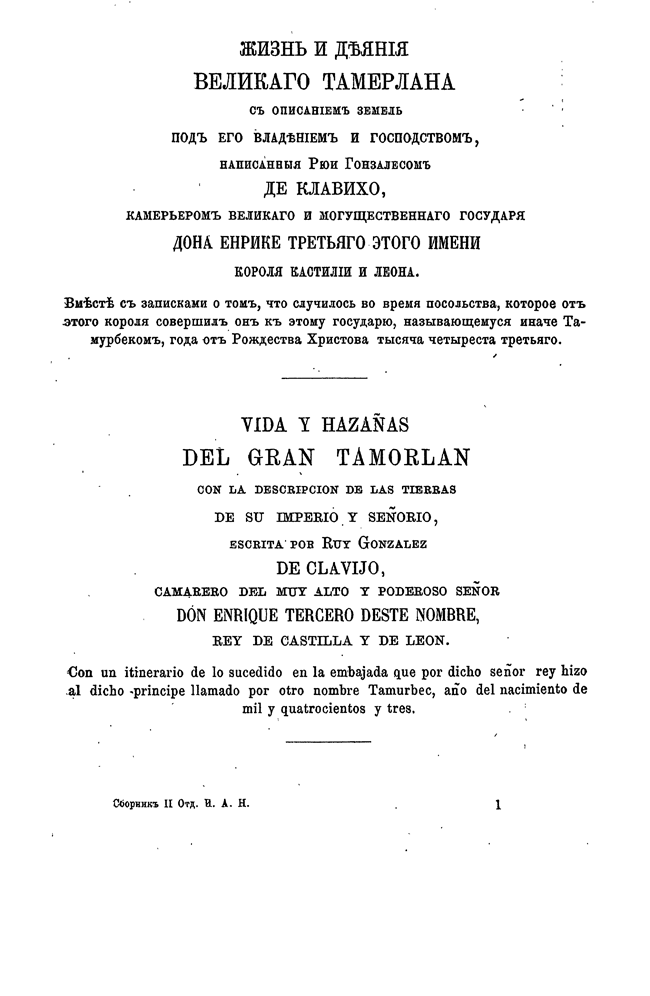 Сочинение Руи де Клавихо — своеобразный памятник испанской прозы: путевые заметки, написанные в форме дневника испанским послом, отправленным во главе ответного посольства в столицу Тимура Самарканд. Это произведение интересно не только как документ, в котором отмечаются глазами европейца факты и события начала XV в. на Востоке, но и как своего рода историческая энциклопедия. Труд Клавихо был создан примерно за полвека до начала испанского книгопечатания, а его издание было осуществлено только через полтора столетия, в пору наивысшего могущества Испании, когда уже были завоеваны Мексика, Перу, когда испанский конкистадор Васко Нуньес Бальбоа через панамский перешеек проник в Южную Америку, когда влияние Испании безраздельно господствовало в Европе. Издание сочинения Клавихо было призвано как бы иллюстрировать дальновидную политику испанских королей, еще в самом начале XV в. осуществивших захват Канарских островов (1402 г.), который стал прологом открытий в Новом Свете, и направлявших посольства на Восток — в Малую Азию и даже в Самарканд.