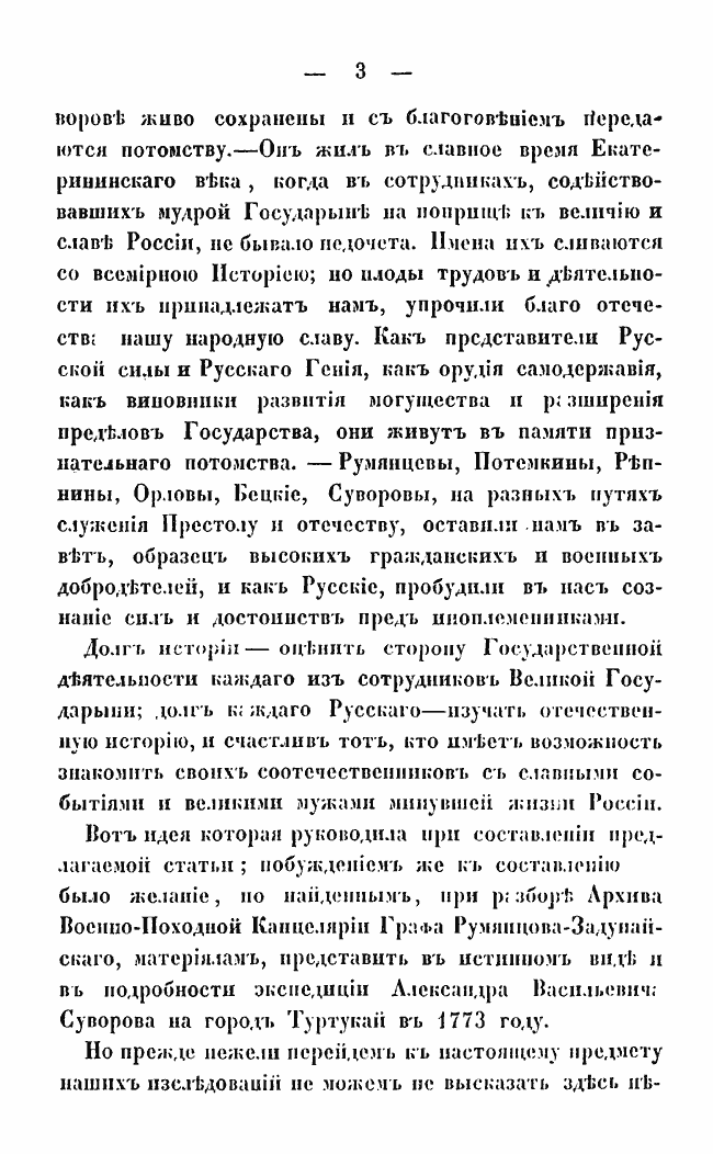 Автор пишет книгу, руководствуясь долгом «изучать отечественную историю… и иметь возможность знакомить своих соотечественников со славными событиями и великими мужами минувшей жизни России» Исследование опирается на материалы, найденные при разборе архива Военно-походной канцелярии графа Румянцева-Задунайского. Автор представляет в истинном виде и подробностях экспедицию А. В. Суворова на г. Туртукай, объясняет причины и цели действий полководца, а также их связь с общим ходом военных действий на нижнем и верхнем Дунае. Издание включает карту «План действий Суворова в первый поиск его на Туртукай».