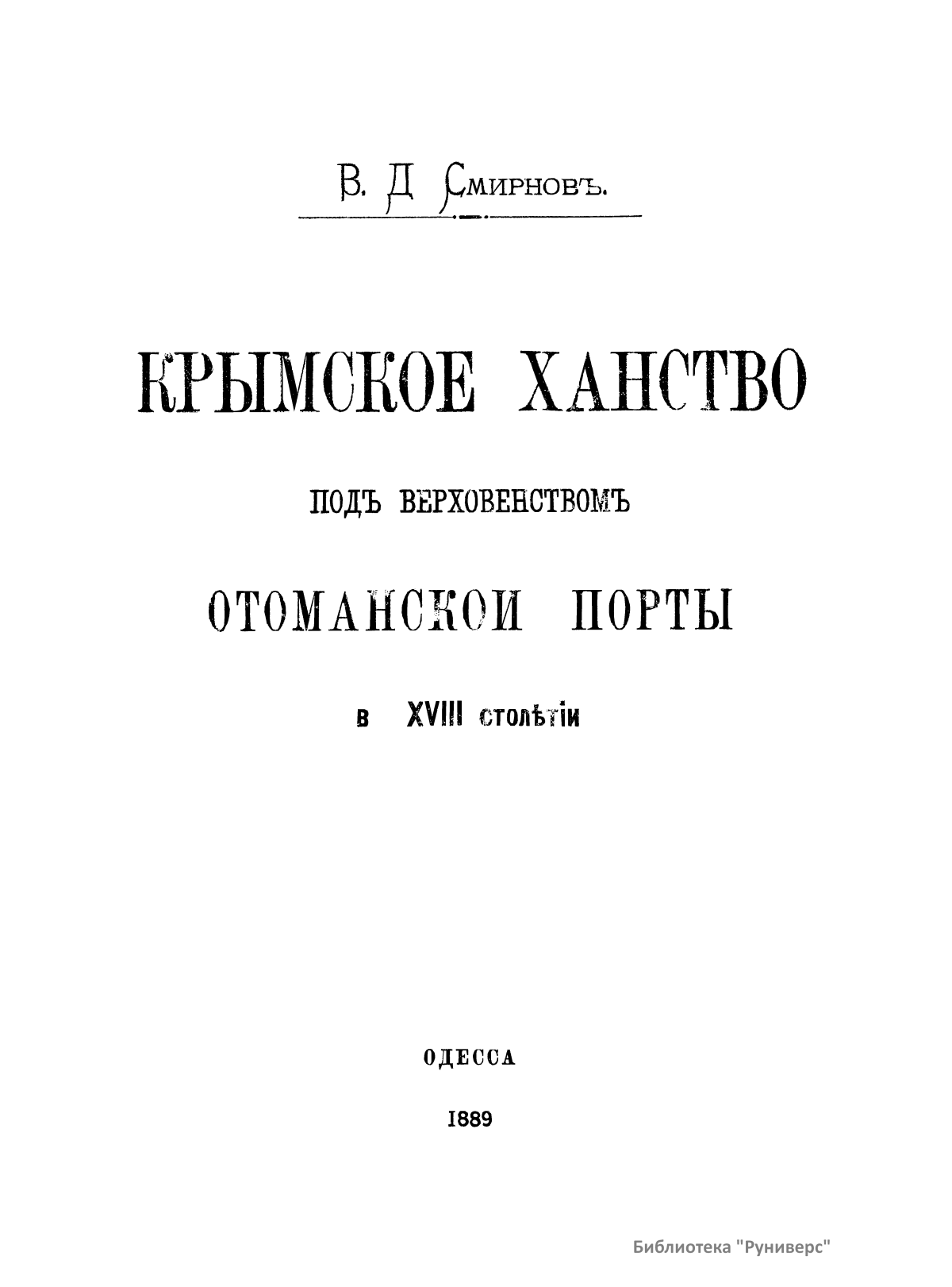 Монографии профессора Петербургского университета В. Д. Смирнова по истории Крымского ханства, впервые вышедшие в свет в 1887 и 1889 гг., - подробное исследование этого государственного образования. Были написаны главным образом по материалам турецких и крымско-татарских источников.