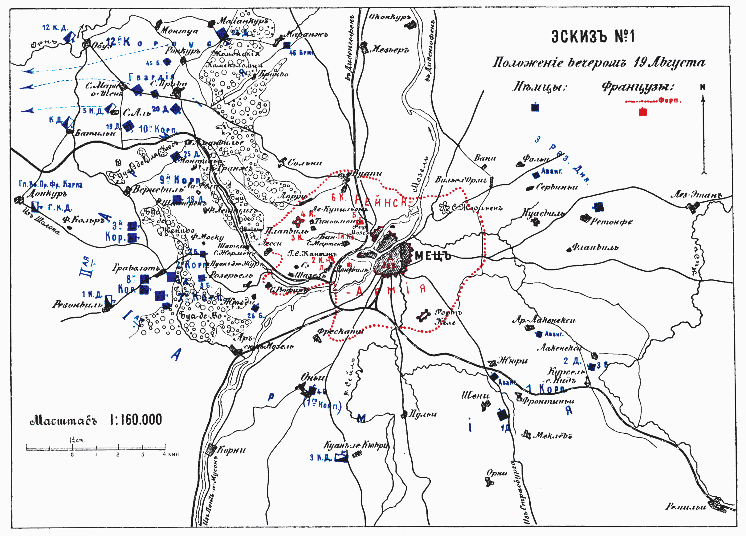 События и бои под Мецом с начала обложения до капитуляции. От 19 августа до 27 октября 1870 года. Эскиз №1. Положение вечером 19 Августа