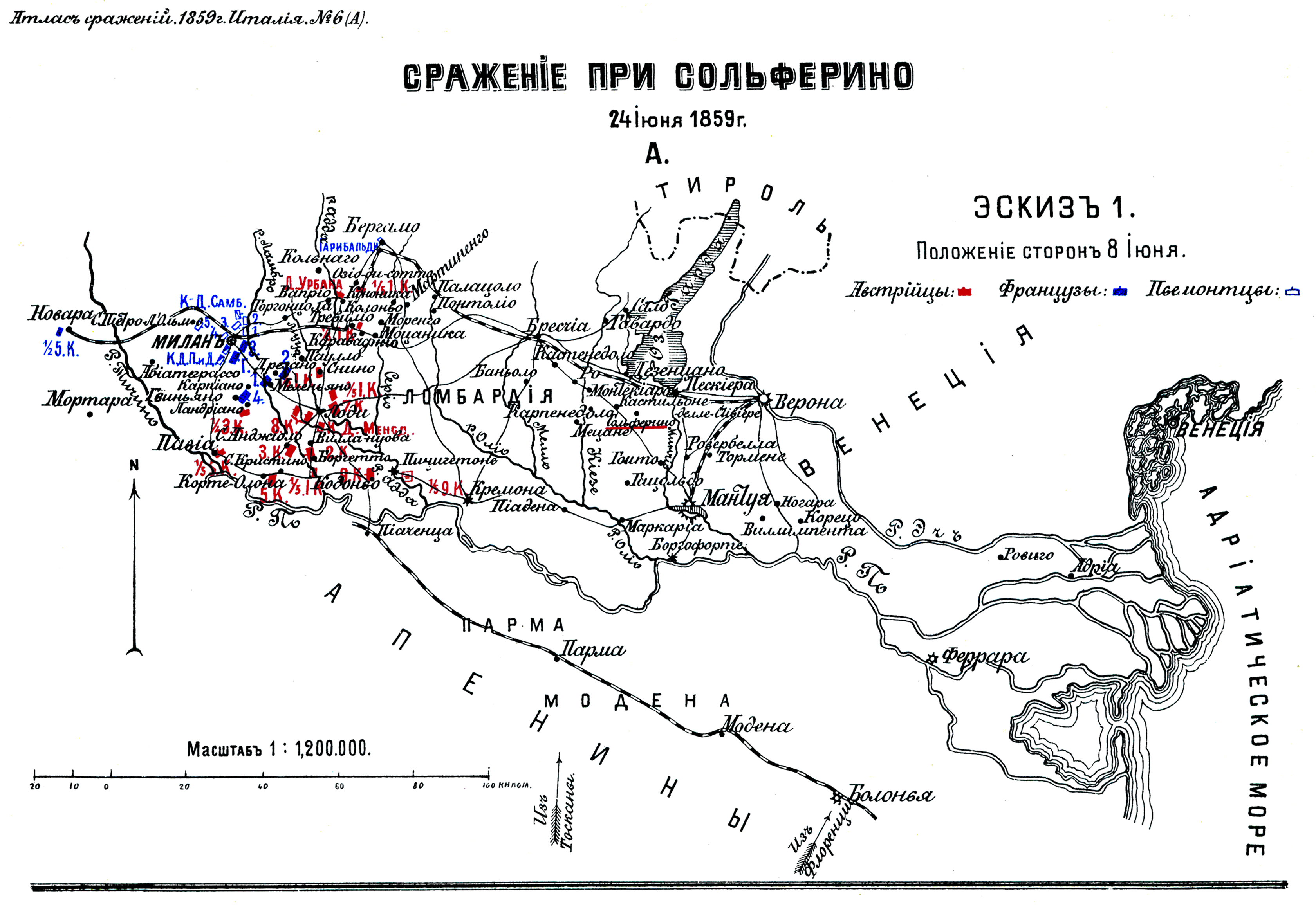 Сражение при Сольферино. 24 июня 1859 года. A. Эскиз 1. Положение сторон 8 июня