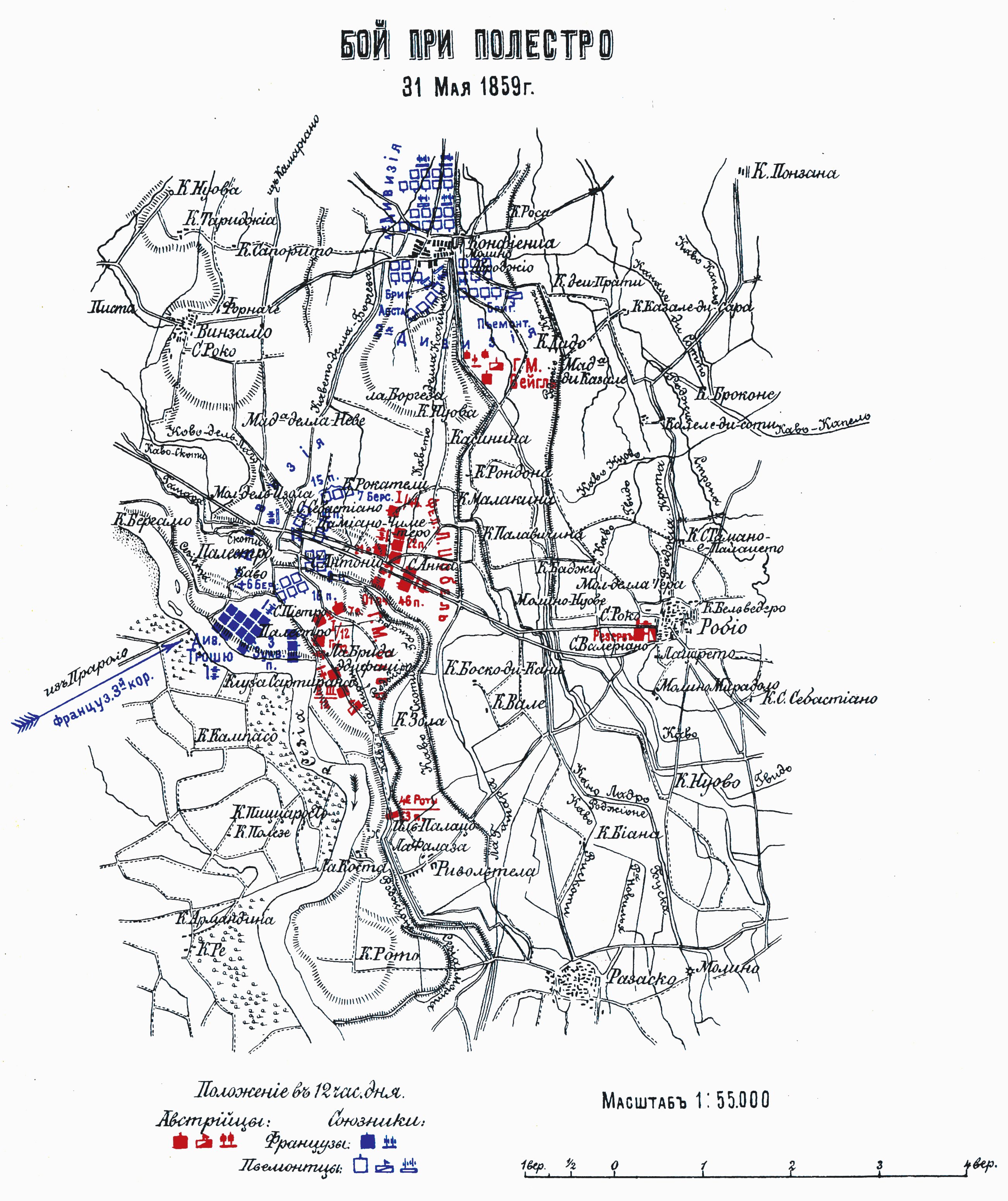 Бой при Полестро 31 мая 1859 года. Положение в 12 час. дня