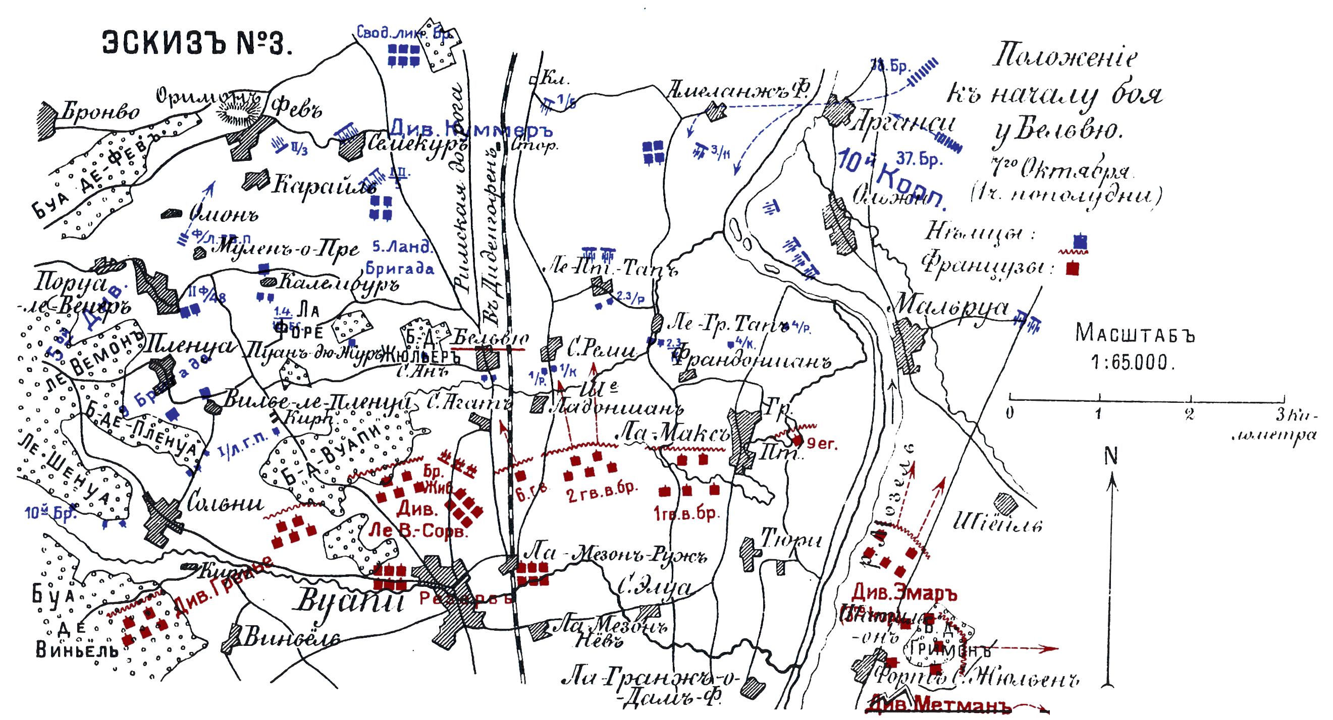 События и бои под Мецем от начала обложения до капитуляции. От 19 Августа до 27 Октября 1870. Эскиз №3. Положение к началу боя у Бельвю. 7 октября. (1 час пополудни)
