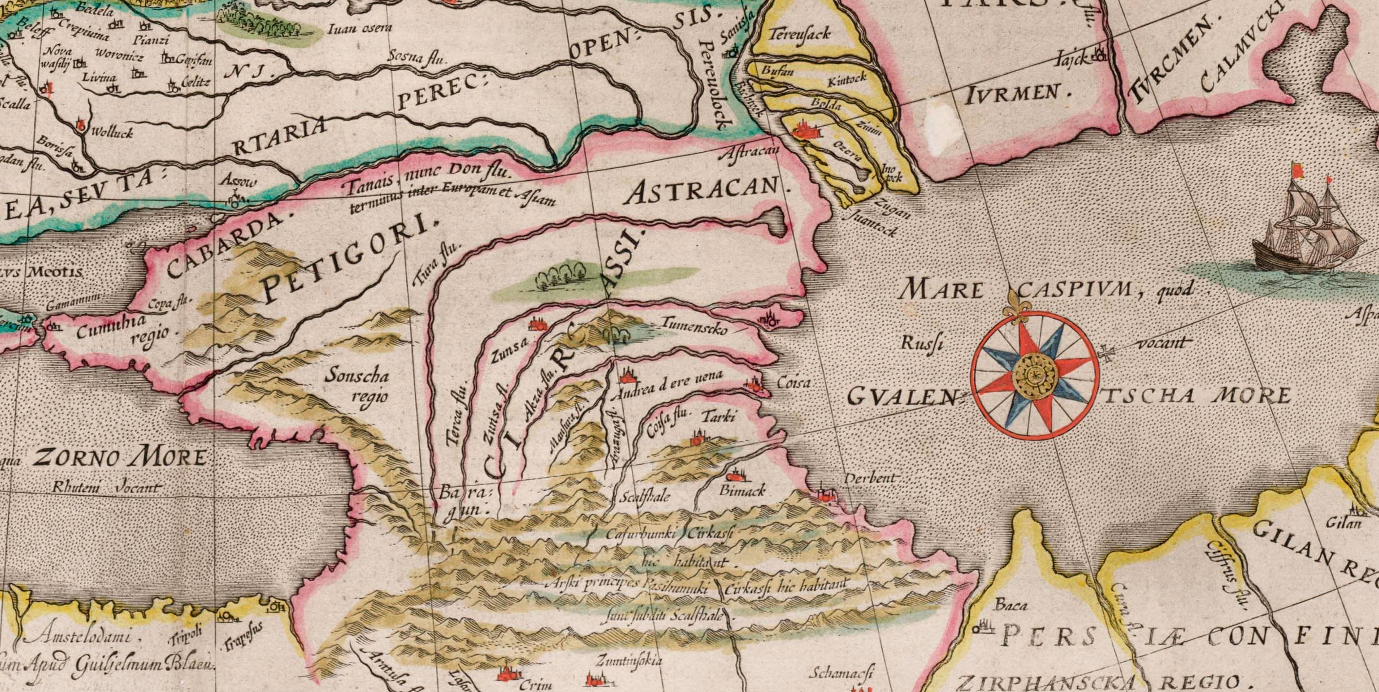 Фрагмент карты России Гесселя Герритса (основанная на чертёже Фёдора Годунова). Кавказ в XV—XVI вв. Сунженский острог (Zunsa).