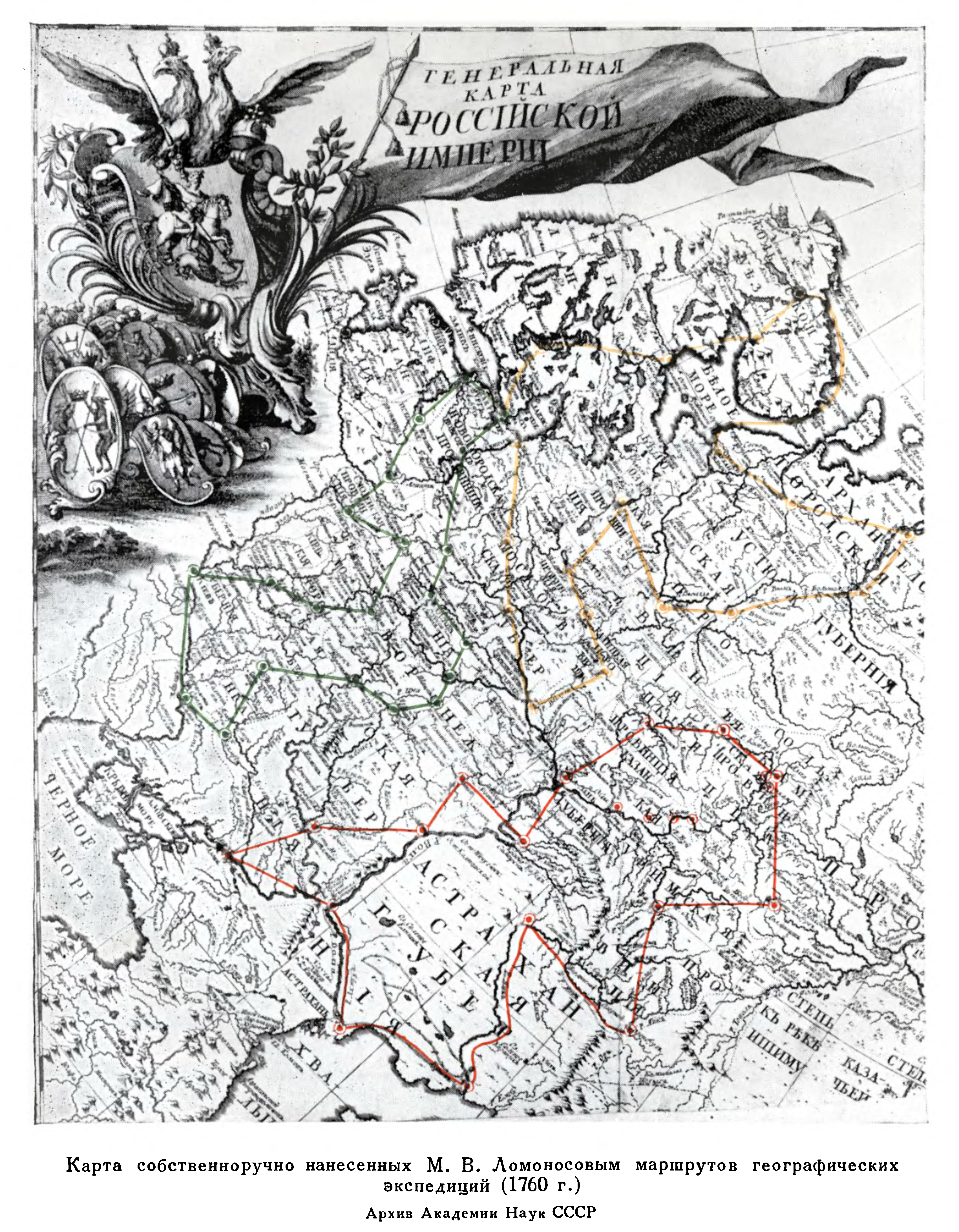 Генеральная карта Российской Империи. Карта собственноручно нанесенных М.В.Ломоносовым маршрутов географических экспедиций (1760 год). Архив Академии Наук СССР
