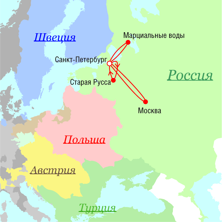 Для книги "Наглядная хронология. Петр I. Дела и дороги" доктором исторических наук, профессором кафедры истории России Средневековья и Нового времени Историко-архивного института РГГУ Игорем Курукиным были реконструированы маршруты поездок Петра I на каждый день, неделю, месяц, год.