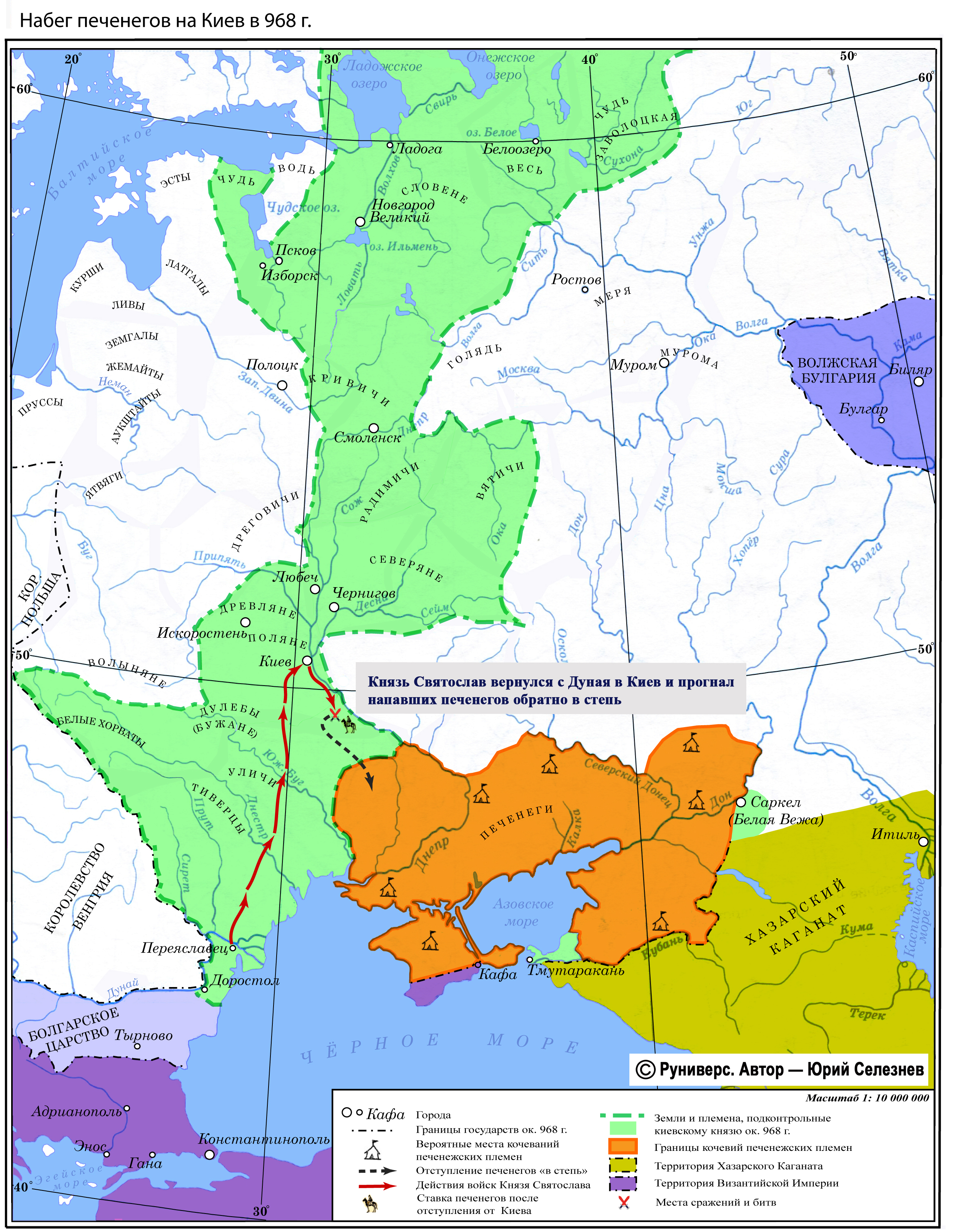 Князь Святослав вернулся с Дуная в Киев и прогнал напавших печенегов обратно в степь.