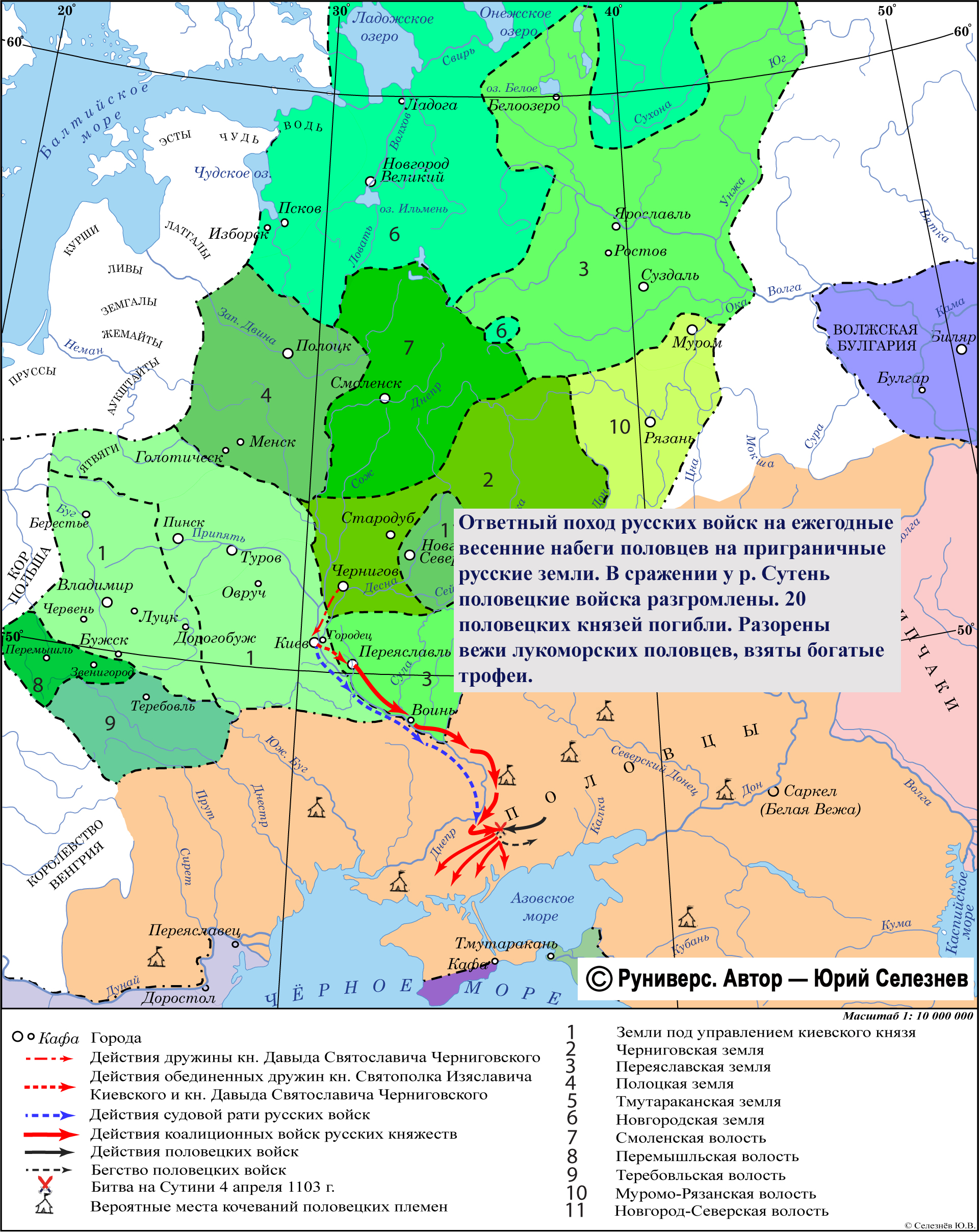 ли. В сражении у р. Сутень половецкие войска разгромлены. 20 половецких князей погибли. Разорены