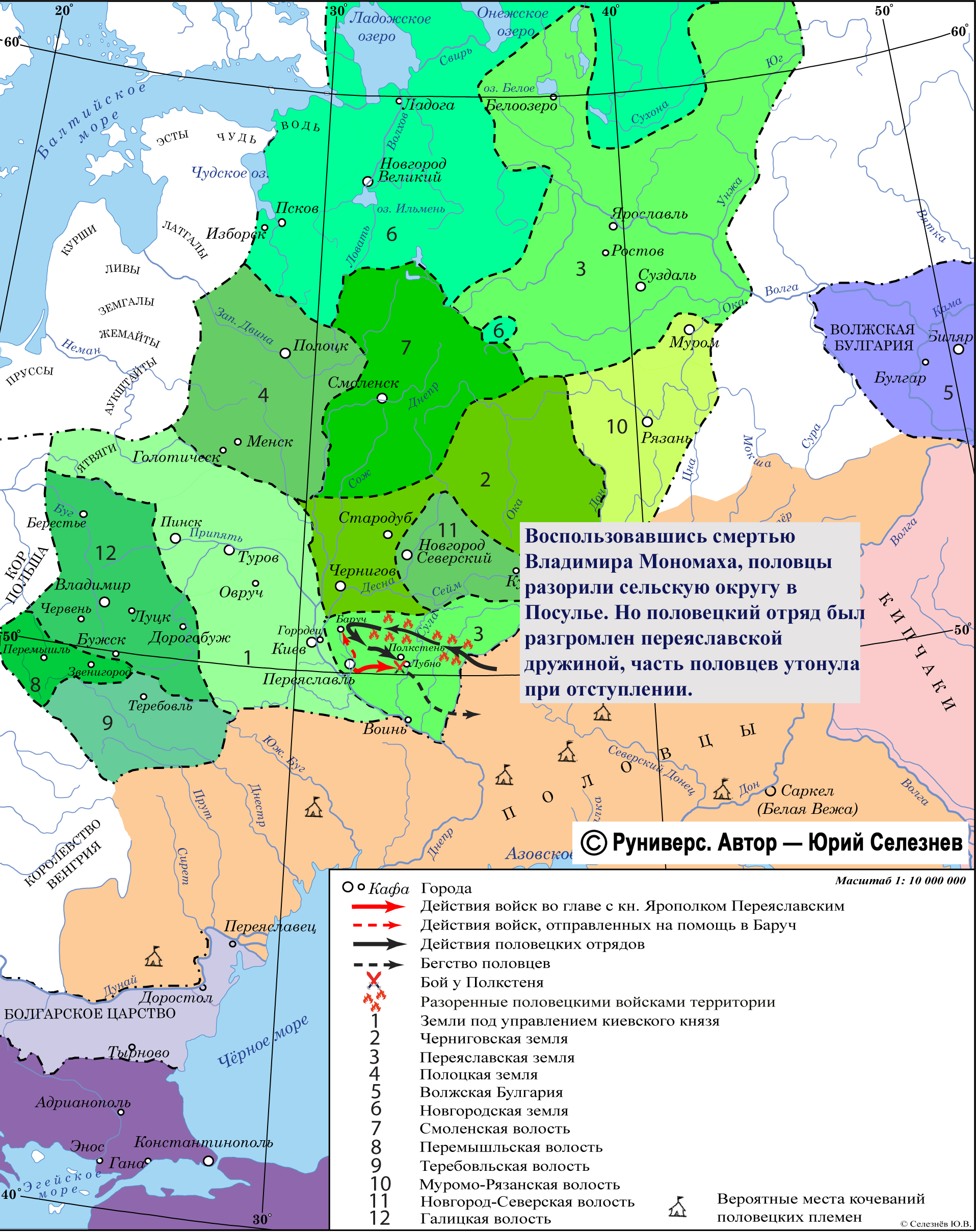 Воспользовавшись смертью Владимира Мономаха, половцы разорили сельскую округу в Посулье. Но половецкий отряд был разгромлен переяславской дружиной, часть половцев утонула при отступлении.