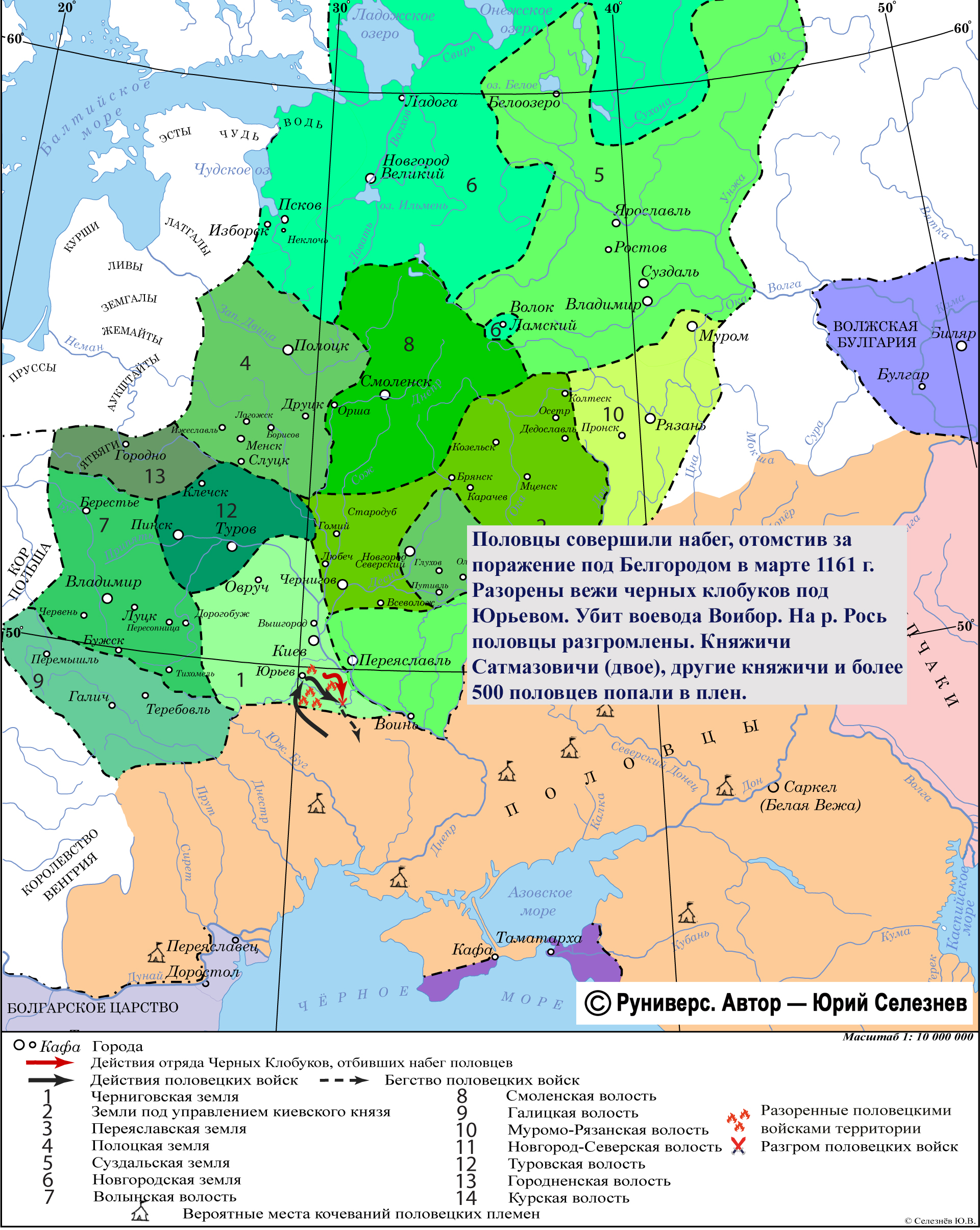 Половцы совершили набег, отомстив за поражение под Белгородом в марте 1161 г. Разорены вежи черных клобуков под Юрьевом. Убит воевода Воибор. На р. Рось половцы разгромлены. Княжичи Сатмазовичи (двое), другие княжичи и более 500 половцев попали в плен.