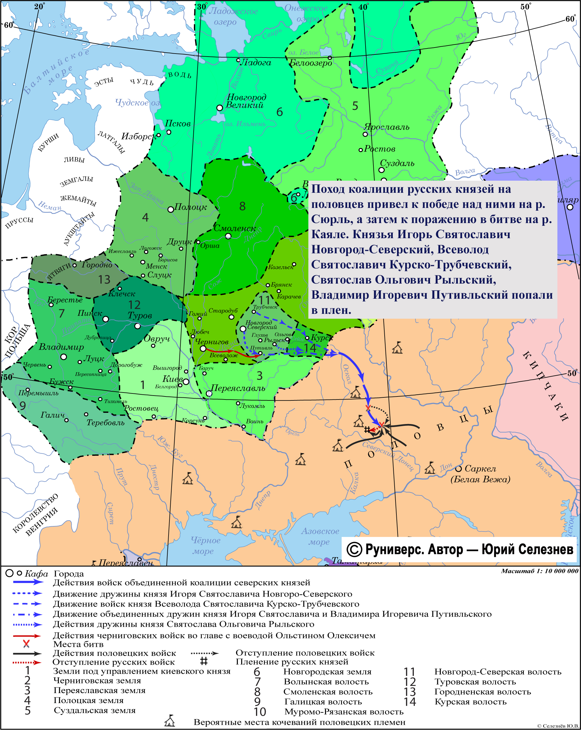Поход коалиции русских князей на половцев привел к победе над ними на р. Сюрль, а затем к поражению в битве на р. Каяле. Князья Игорь Святославич Новгород-Северский, Всеволод Святославич Курско-Трубчевский, Святослав Ольгович Рыльский, Владимир Игоревич Путивльский попали в плен.