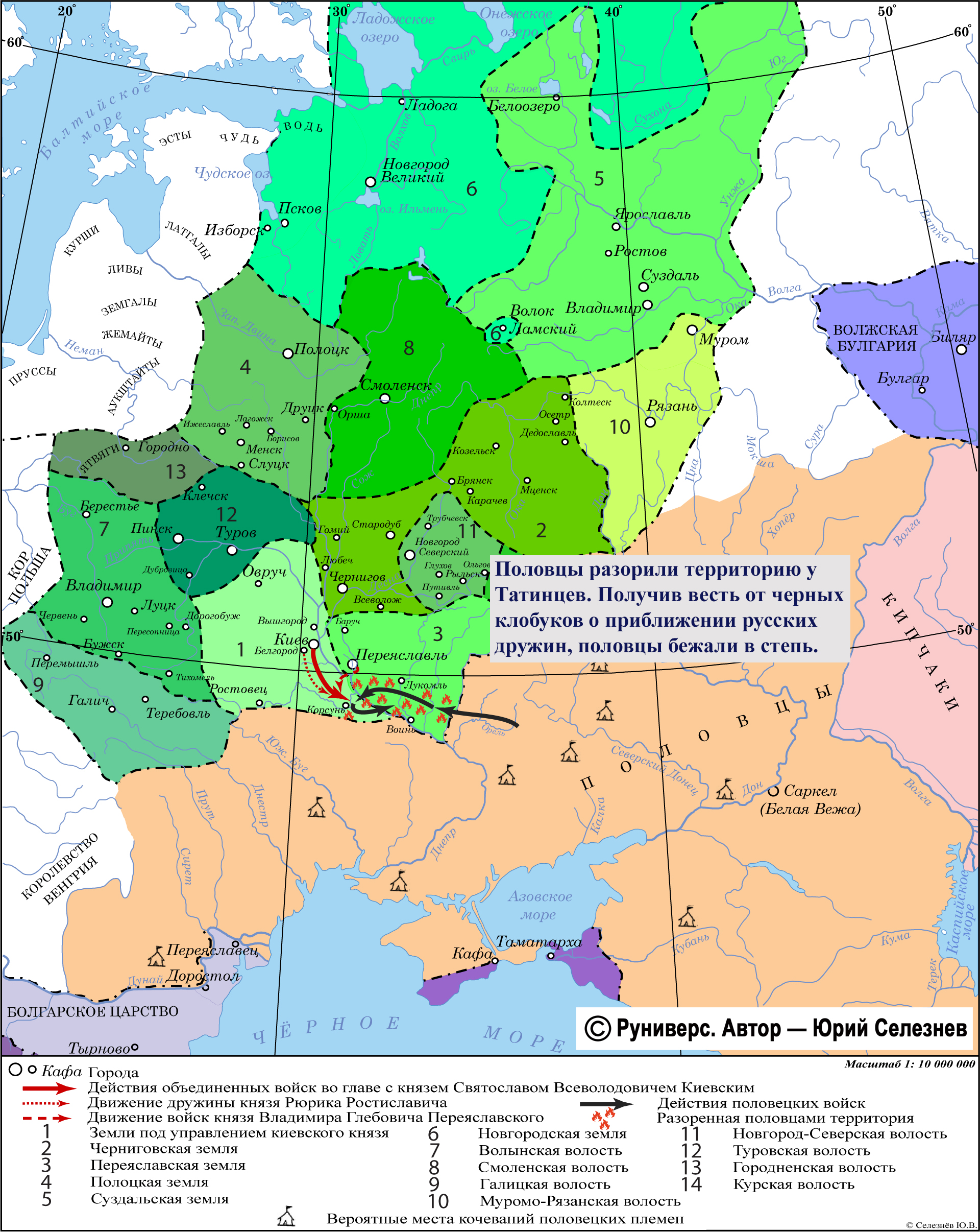Половцы разорили территорию у Татинцев. Получив весть от черных клобуков о приближении русских дружин, половцы бежали в степь.