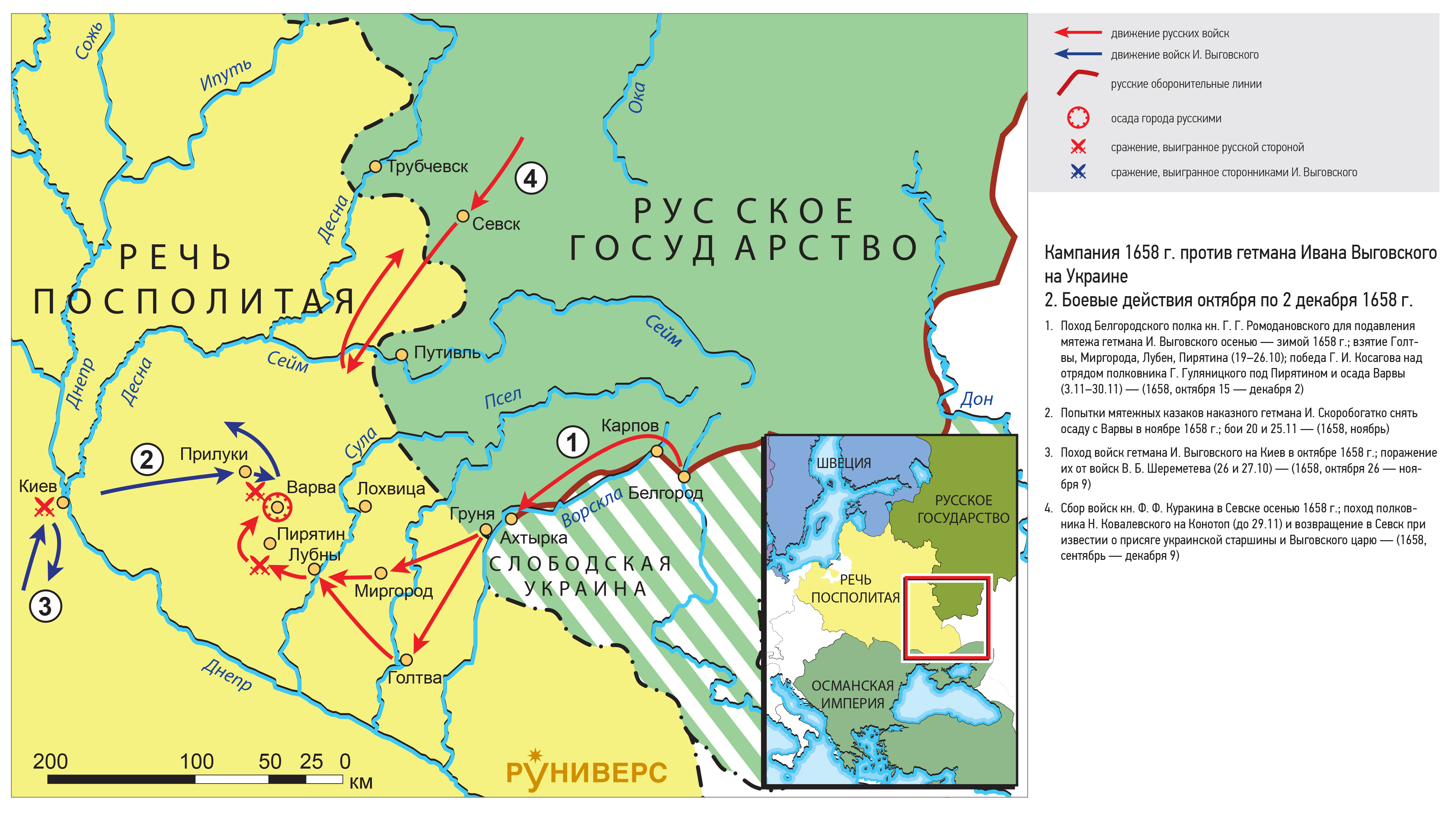 1. Поход Белгородского полка кн. Г. Г. Ромодановского для подавления мятежа гетмана И. Выговского осенью — зимой 1658 г.; взятие Голтвы, Миргорода, Лубен, Пирятина (19–26.10); победа Г. И. Косагова над отрядом полковника Г. Гуляницкого под Пирятином и осада Варвы (3.11–30.11) — (1658, октября 15 — декабря 2)