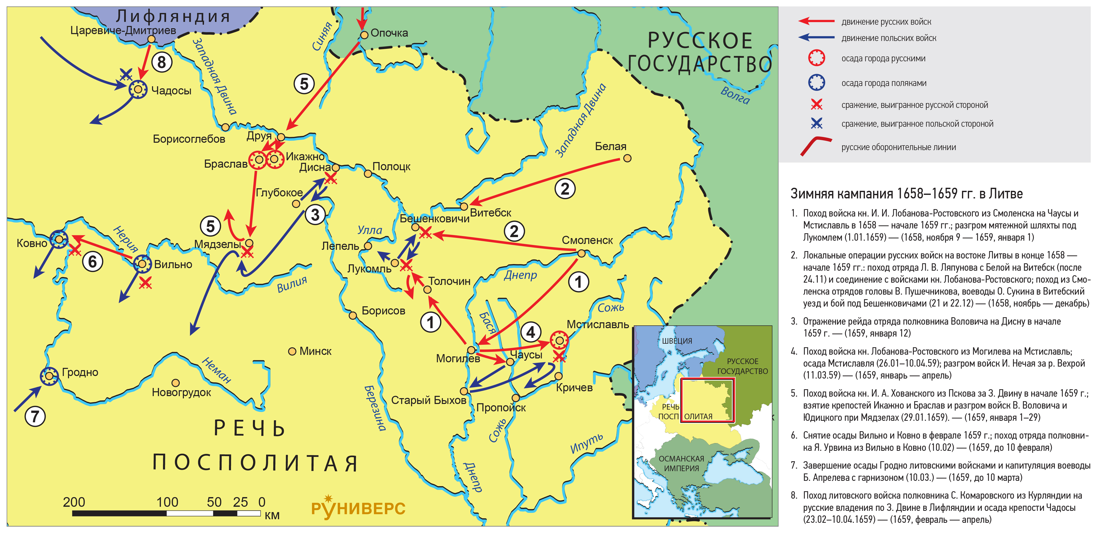 1. Поход войска кн. И. И. Лобанова-Ростовского из Смоленска на Чаусы и Мстиславль в 1658 — начале 1659 гг.; разгром мятежной шляхты под Лукомлем (1.01.1659) — (1658, ноября 9 — 1659, января 1)