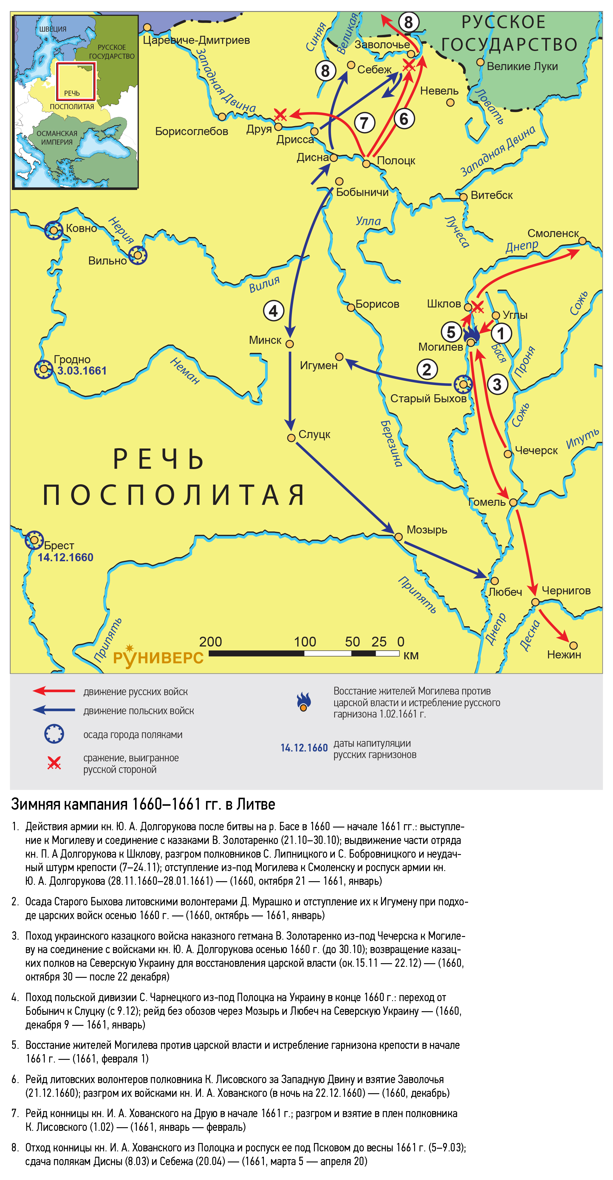 1. Действия армии кн. Ю. А. Долгорукова после битвы на р. Басе в 1660 — начале 1661 гг.: выступление к Могилеву и соединение с казаками В. Золотаренко (21.10–30.10); выдвижение части отряда кн. П. А Долгорукова к Шклову, разгром полковников С. Липницкого и С. Бобровницкого и неудачный штурм крепости (7–24.11); отступление из-под Могилева к Смоленску и роспуск армии кн. Ю. А. Долгорукова (28.11.1660–28.01.1661) — (1660, октября 21 — 1661, январь)