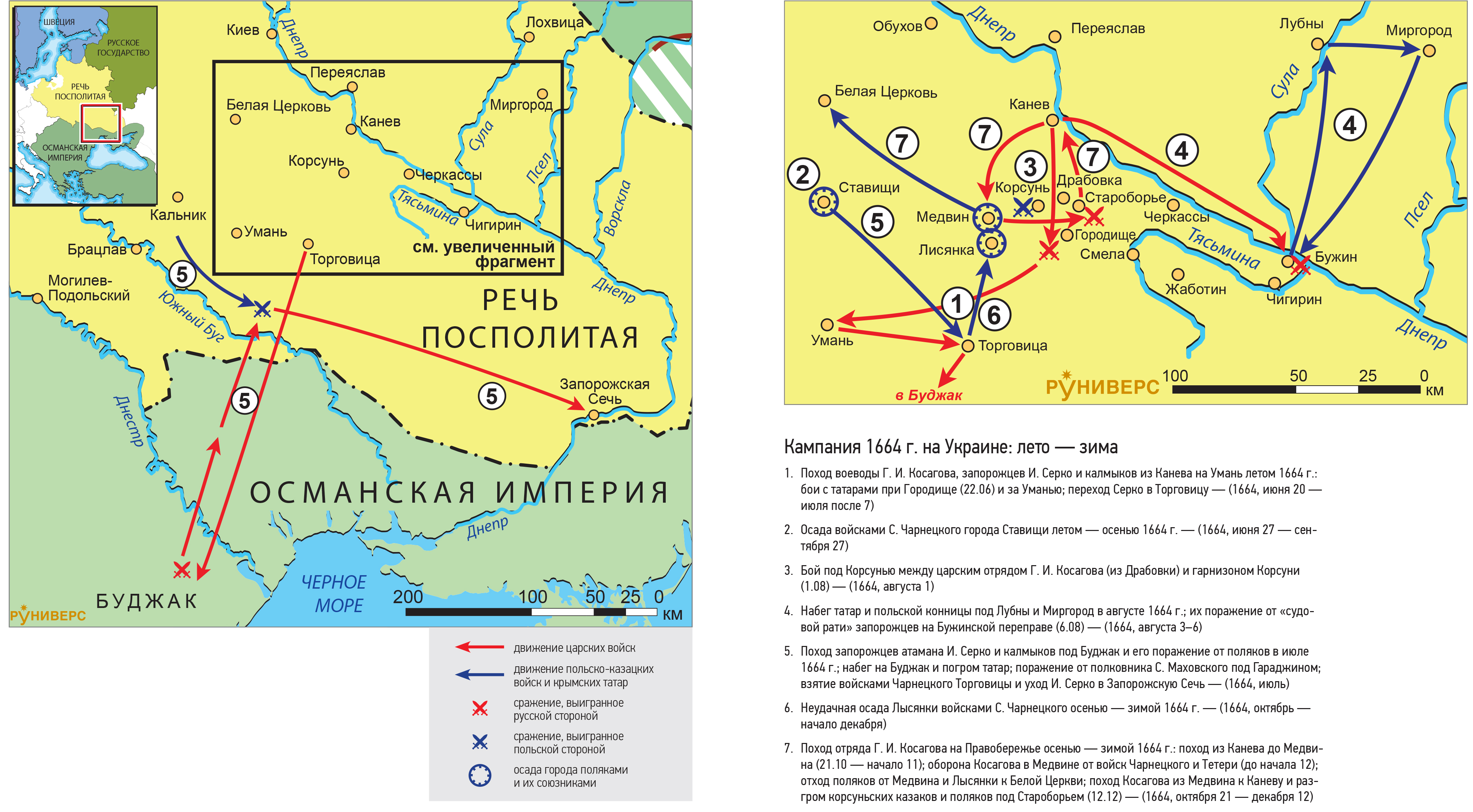 7. Поход отряда Г. И. Косагова на Правобережье осенью — зимой 1664 г.: поход из Канева до Медвина (21.10 — начало 11); оборона Косагова в Медвине от войск Чарнецкого и Тетери (до начала 12); отход поляков от Медвина и Лысянки к Белой Церкви; поход Косагова из Медвина к Каневу и разгром корсуньских казаков и поляков под Староборьем (12.12) — (1664, октября 21 — декабря 12)