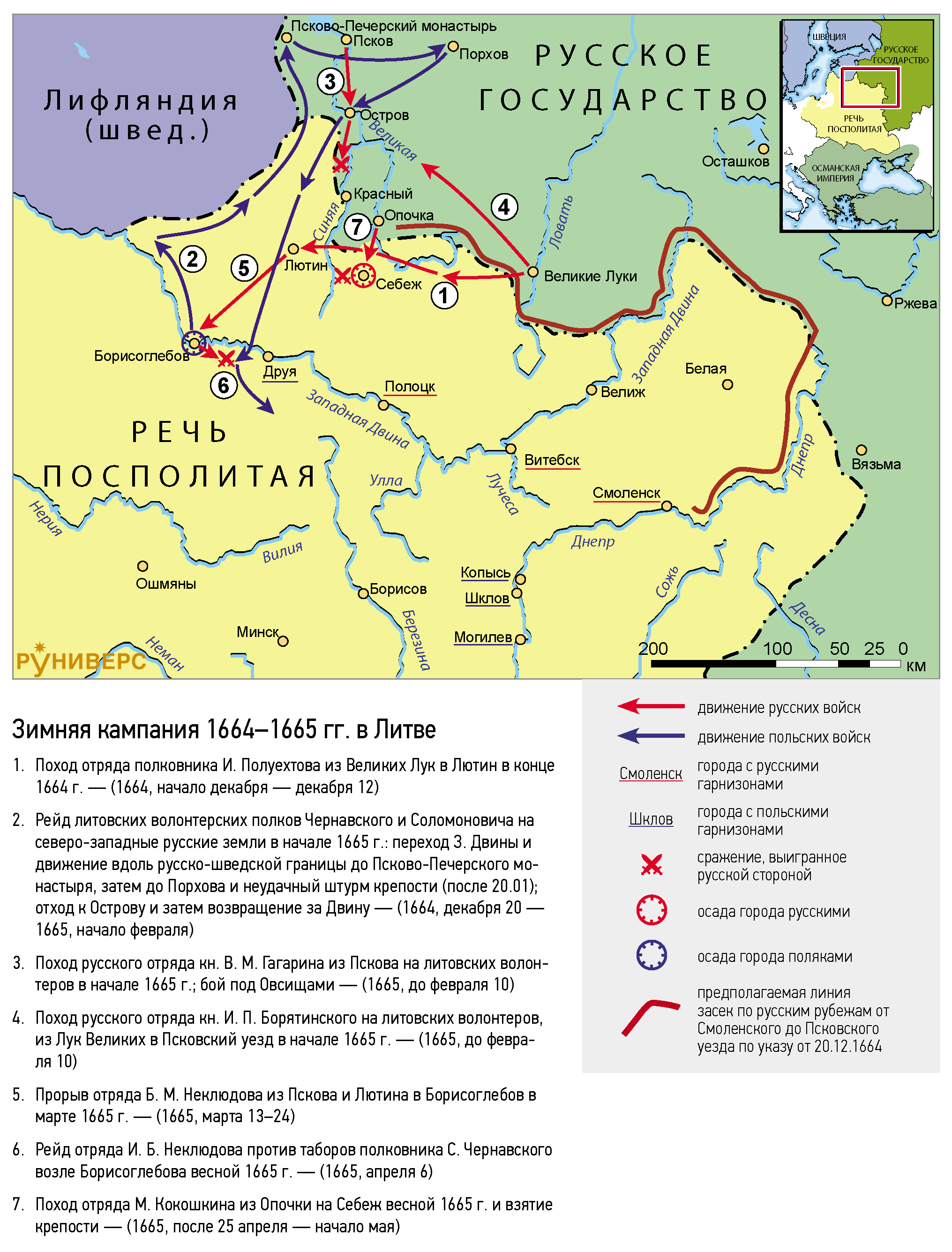 2. Рейд литовских волонтерских полков Чернавского и Соломоновича на северо-западные русские земли в начале 1665 г.: переход З. Двины и движение вдоль русско-шведской границы до Псково-Печерского монастыря, затем до Порхова и неудачный штурм крепости (после 20.01); отход к Острову и затем возвращение за Двину — (1664, декабря 20 — 1665, начало февраля)