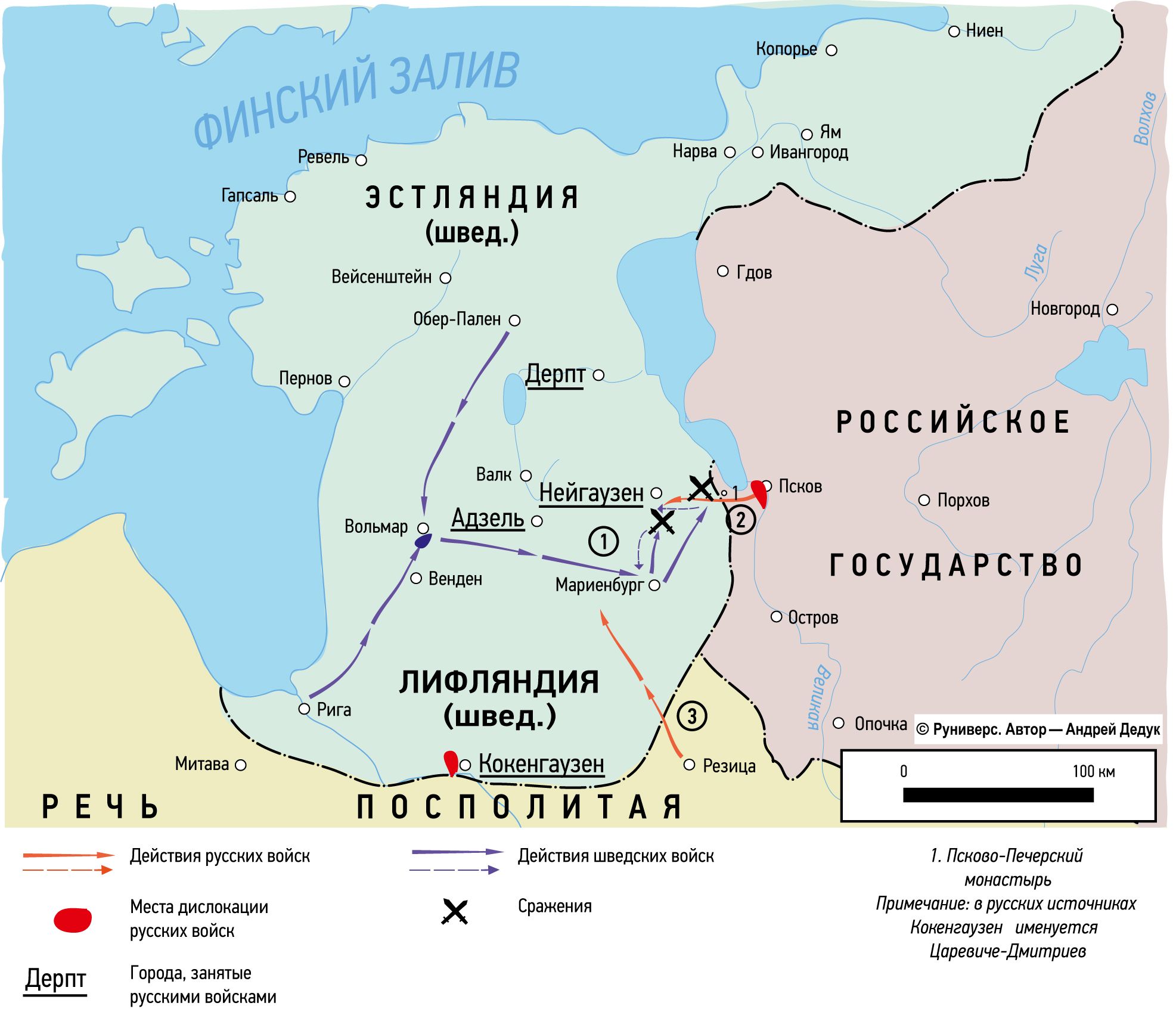 1. Поход шведской армии М. Делагарди на Адзель и бой у Псково-Печерского монастыря в марте 1657 г.: сбор шведской армии у Вольмара (январь — март 1657 г.); поход армии М. Делагарди на Адзель (около 10.03); бой между русским отрядом из Пскова и шведским отрядом подполковника Тизенгаузена при Псково-Печерском монастыре (17.03); отступление шведов к Риге — (1657, январь — март).
