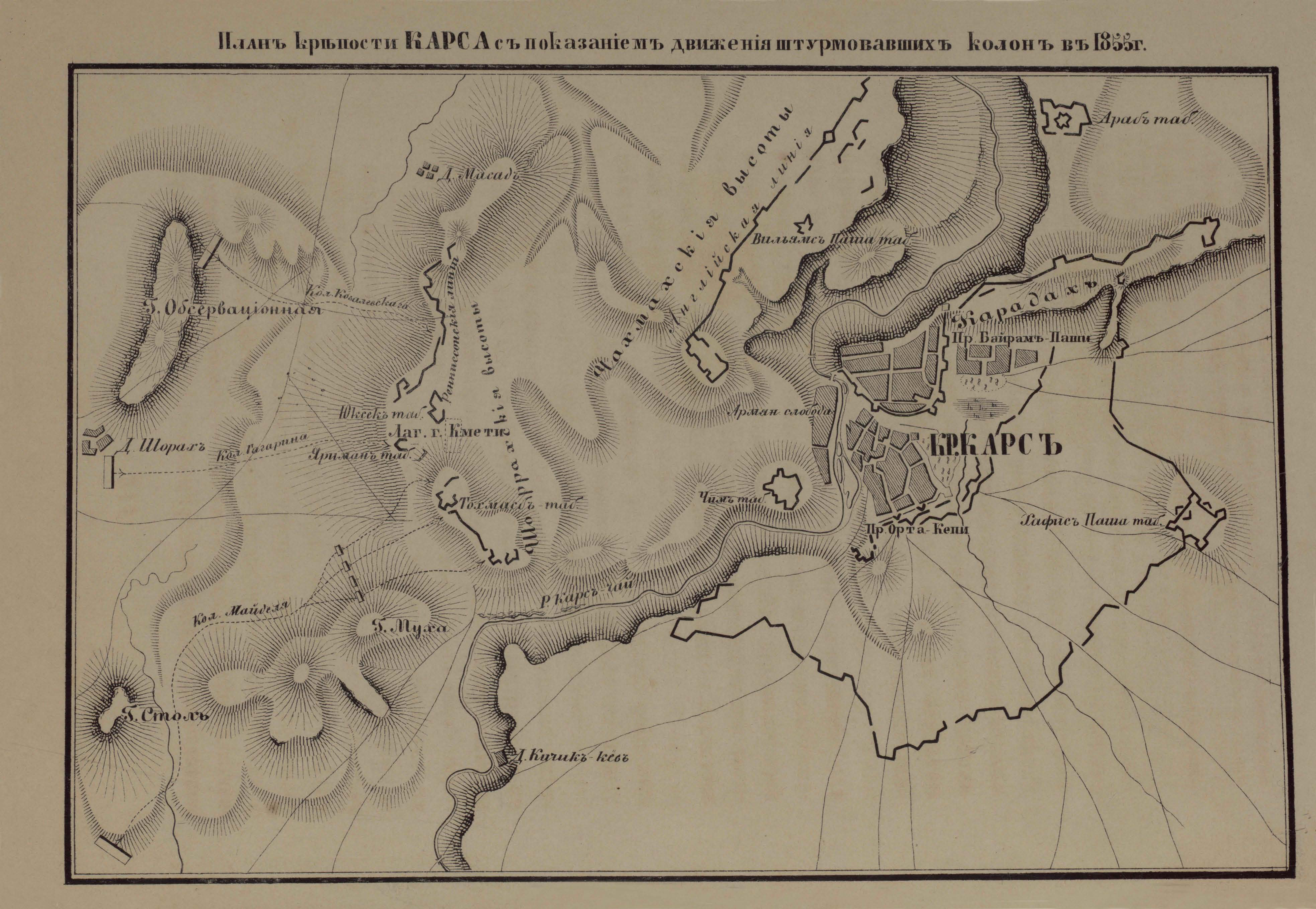 Крепость Карса с показанием движения штурмовавших колон в 1855 году