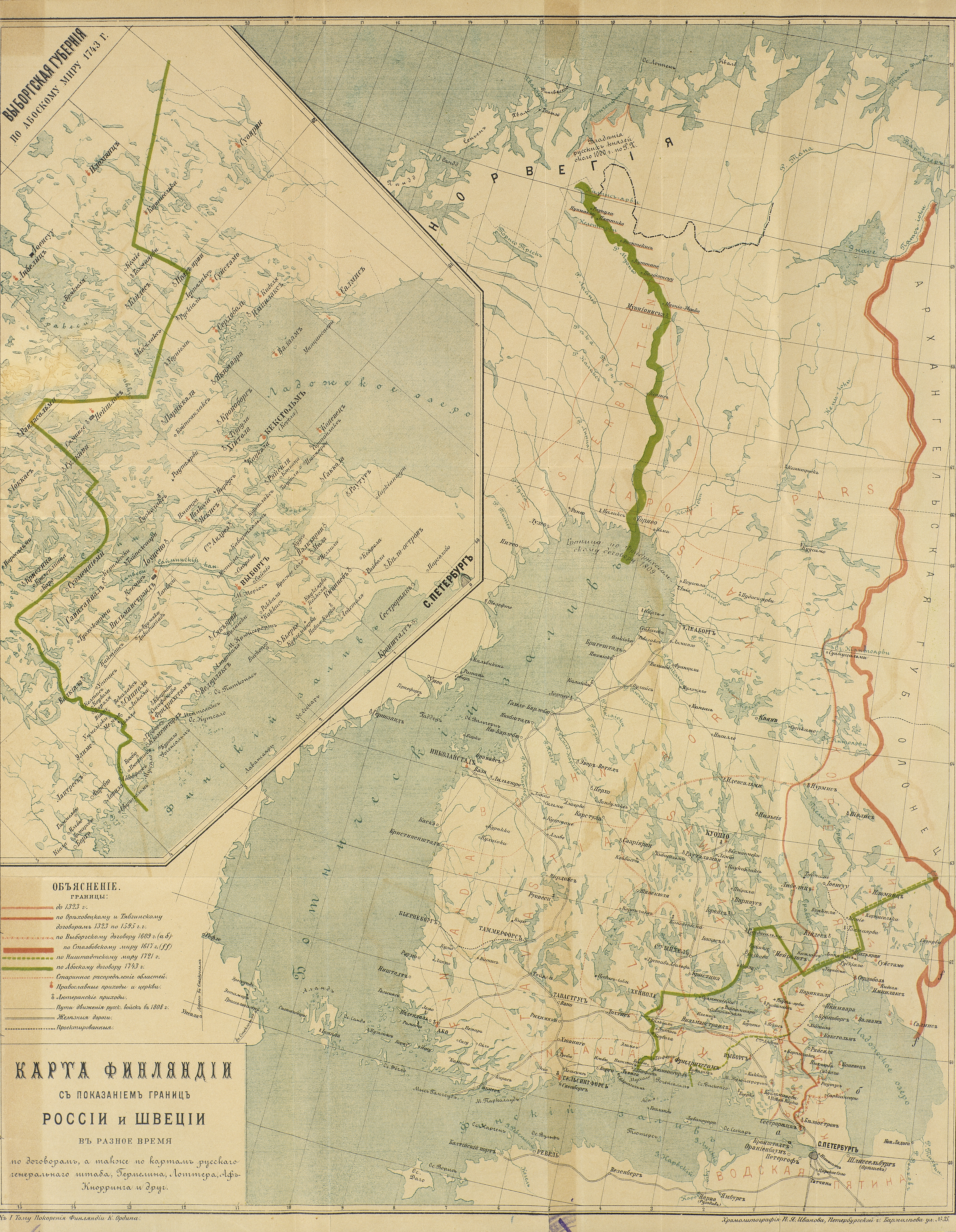 Карта Финляндии с указанием границ России и Швеции в разное время по договорам, а также по картам генерального штаба, Гермелина, Лоттера, Аф-Кнорринга и друг.